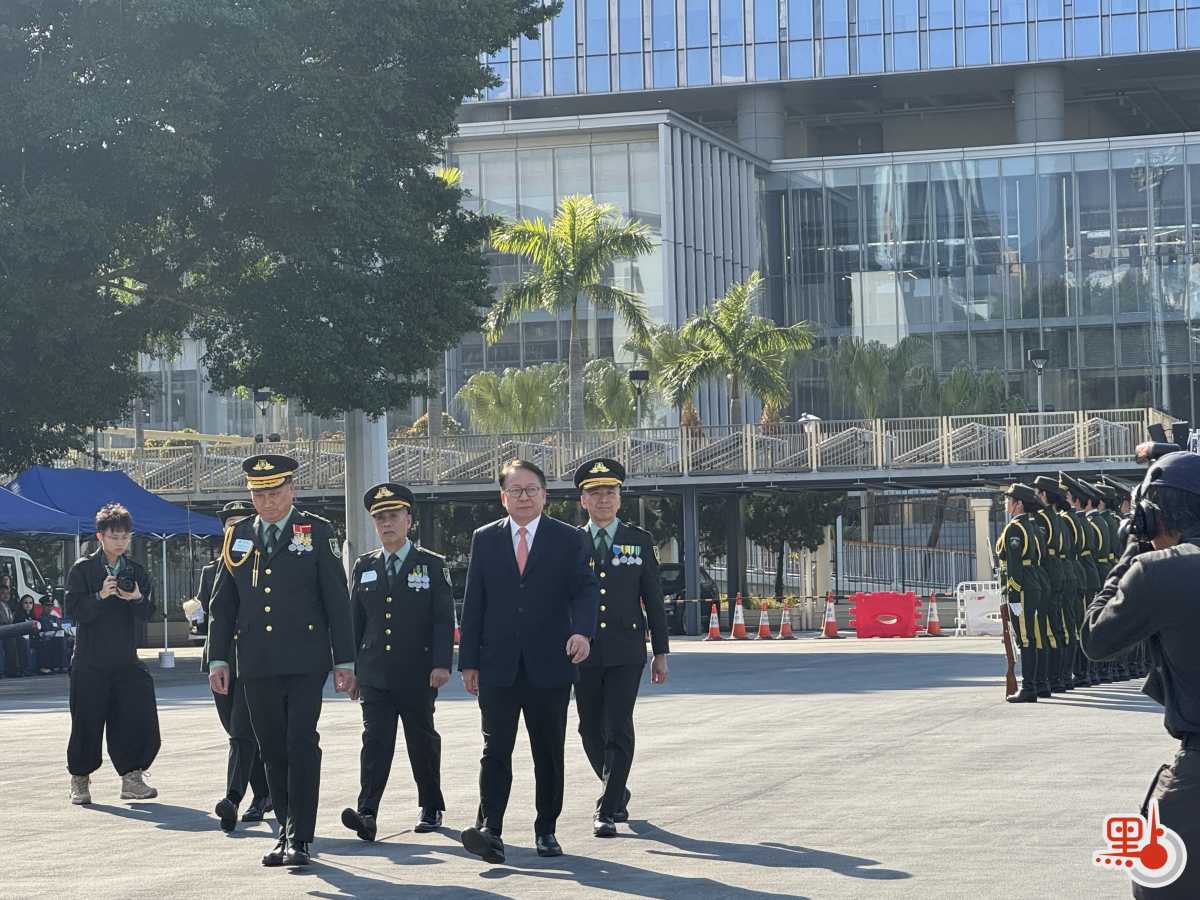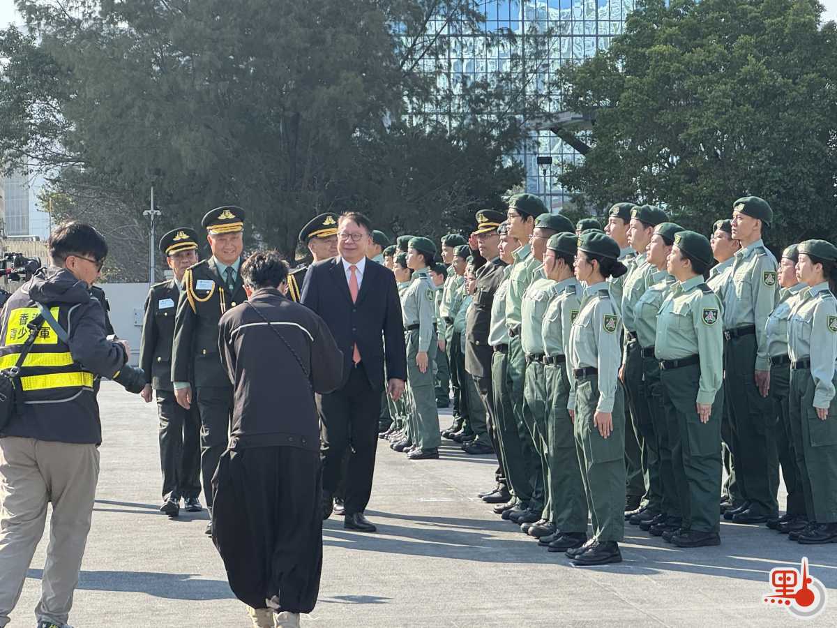 儀式進入分列式檢閱環節,陳國基於檢閱台檢閱各方隊,青少年們則踏着整齊的步伐經過檢閱台並致敬,展現出高質素的紀律與毅力。