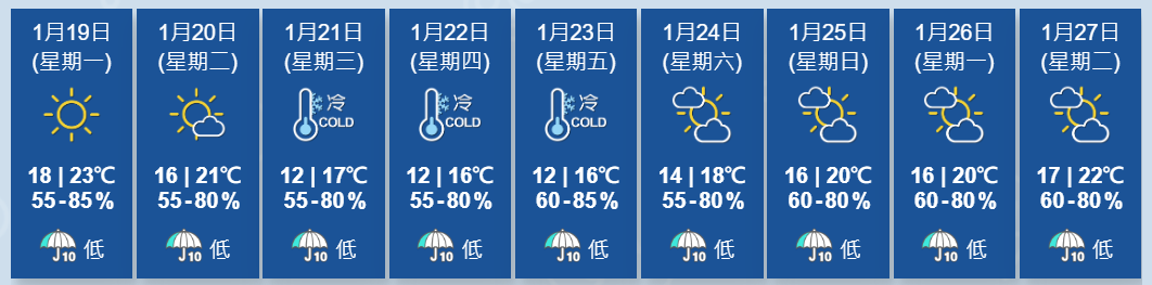 天文台表示,乾燥的東北季候風會在今日(19日)繼續為廣東帶來普遍晴朗的天氣,該區日間溫暖。預料一股強烈冬季季候風會在明日開始逐漸影響華南,該區風勢增強,隨後兩三日廣東沿岸天氣轉冷,同時一道廣闊雲帶覆蓋該區。受一股偏東氣流影響,周末期間華南沿岸氣溫稍為回升,但早上仍然清涼。