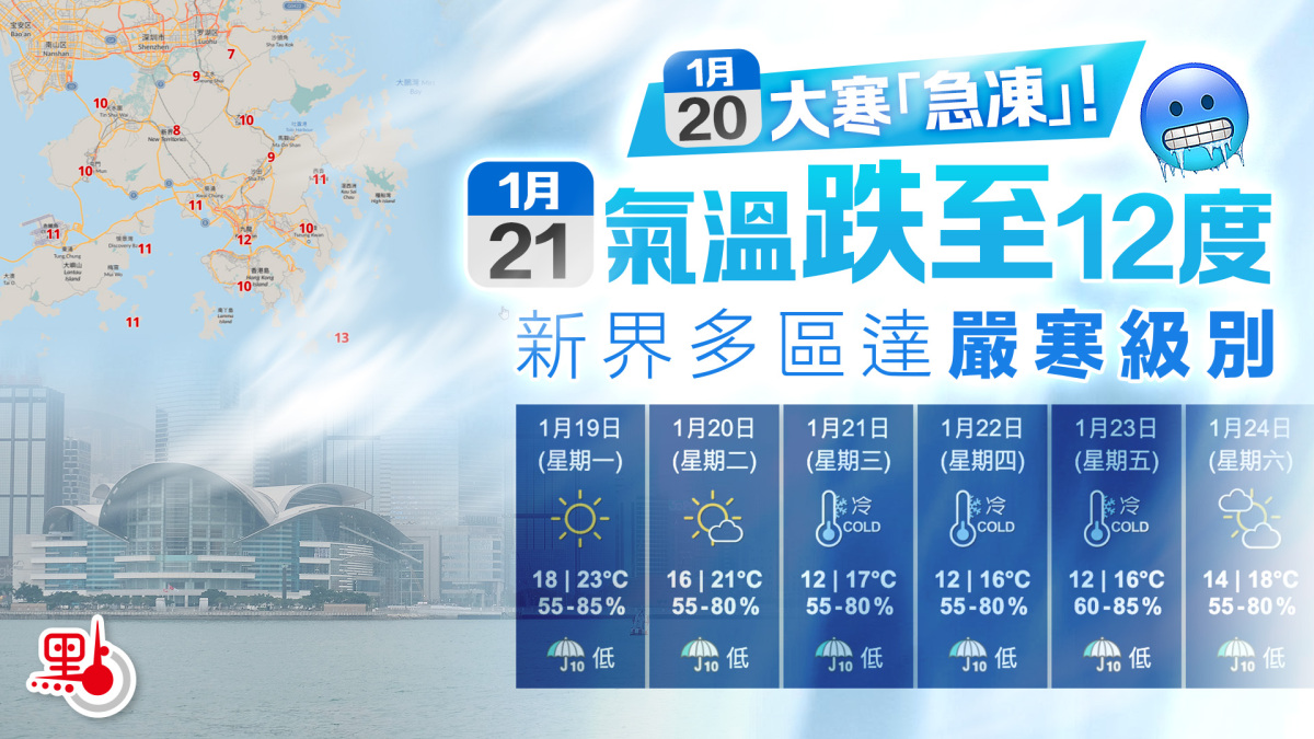 【點新聞報道】明日(20日)大寒,本港未來幾日氣溫驟降。天文台表示,本港明日風勢增強,晚上氣溫顯著下降,隨後兩三日逐步轉冷,最低氣溫在12度左右。周三(21日)日間,新界多區氣溫跌至10度或以下,打鼓嶺更降至7度左右,達到嚴寒級別。