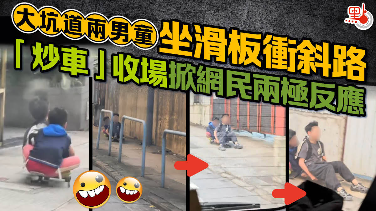 有網民在社交平台threads分享一段影片,可見兩名男童在大坑道近巴士站的一段長斜坡上,雙雙坐在一塊長形滑板上俯衝,滑板速度快得驚人,他們不斷發出興奮的尖叫聲,途人見狀紛紛閃避,最後失控「炒車」跌倒在地。
