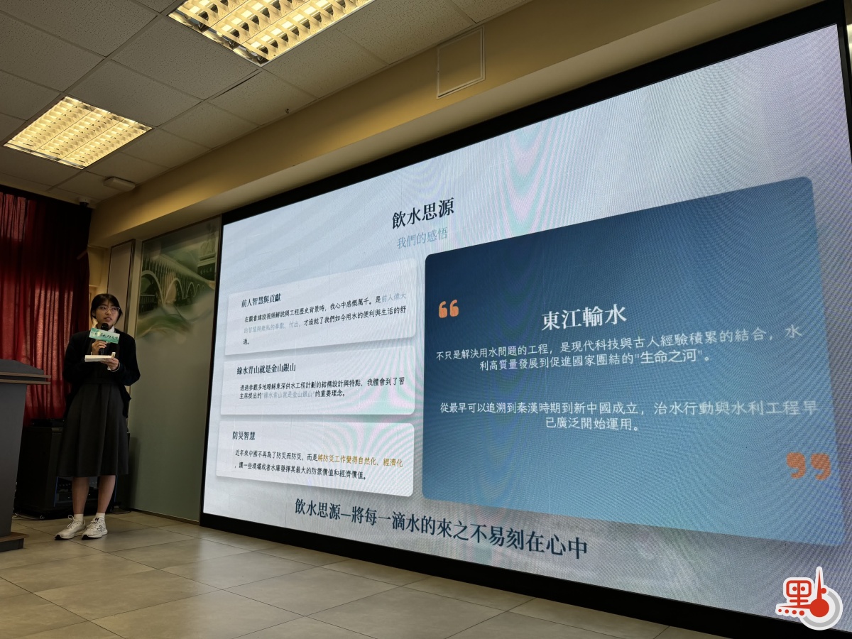 來自培僑中學的學生黃可晴及其組員以「不忘來時路」為主題,分享走訪新豐江水電站、深圳水庫等多地的感悟。她震撼於建設者肩挑背扛的付出,領略到東深供水工程的「生命線」分量,體會到生物淨化、逆滲透等技術帶來的保障,深刻感受到工程背後血濃於水的同胞深情與國家支持。