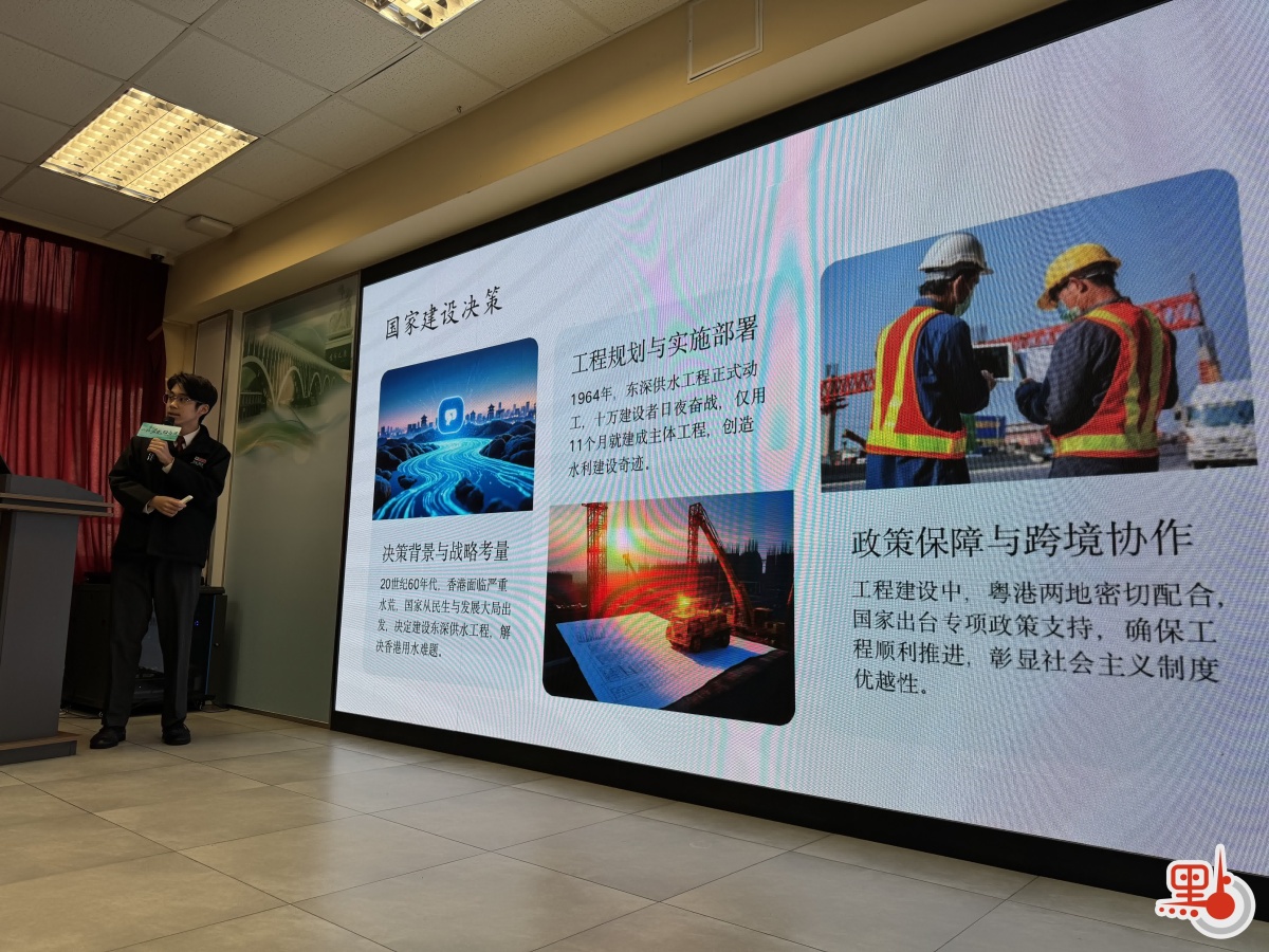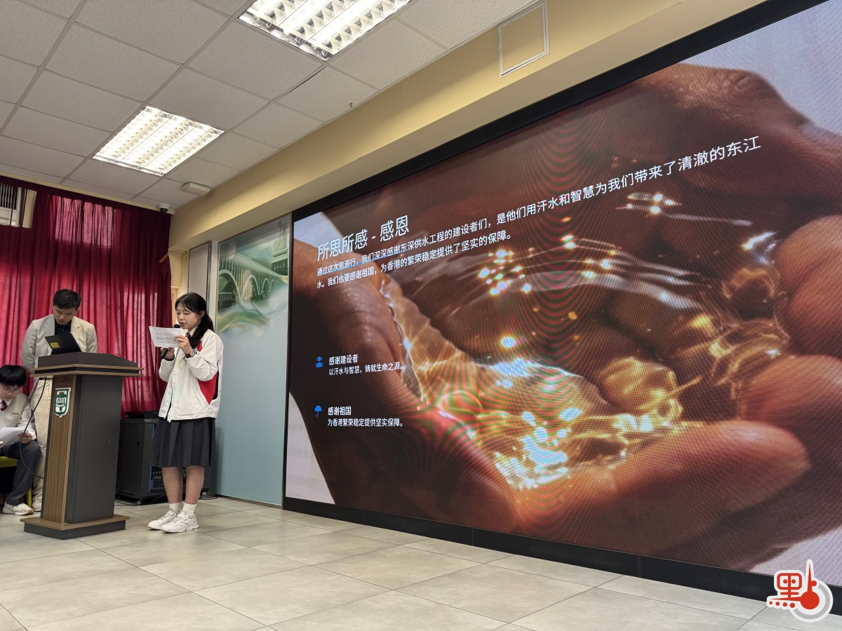 培僑中學學生盧奕及其組員則展示了從南沙水文巡測基地的數據堅守,到新豐江水電站的精神震撼,再到東深供水紀念園的歷史觸動。她表示工程結束了香港缺水困境,並支撐其經濟轉型,她對建設者的無私奉獻與祖國的堅強後盾表示感恩。