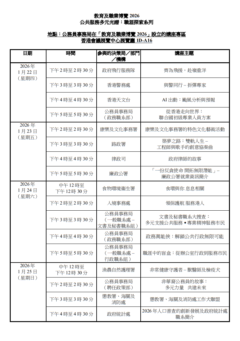 公務員事務局的展區(展覽廳1D,編號:1D-C02)除了提供公務員招聘資訊外,政務主任、行政主任、法定語文主任、訓練主任和文書及秘書職系的代表會在場向參加者分享他們寶貴的職場故事和職業前景。公務員事務局亦將於1月22日在展覽廳1E的交流園地舉辦三場專題講座,分別介紹政務職系、行政主任職系和文書及秘書職系的工作特色和公共服務使命。