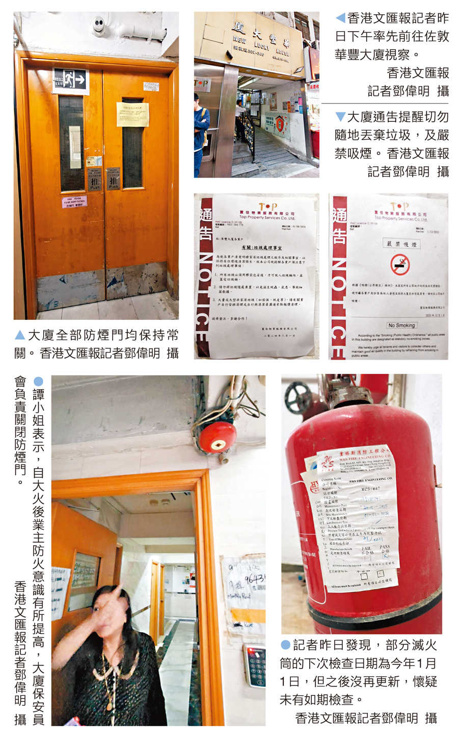 香港消防處昨日(19日)宣布展開為期兩個月的樓宇消防裝置及設備巡查行動,重點覆蓋1987年或之前興建的1,500幢住用或綜合用途建築。為此,香港文匯報記者昨日下午率先前往於1964年落成、2024年4月曾發生奪命火災的佐敦華豐大廈視察,發現大廈雖然全部防煙門均保持常關狀態,大部分居民亦在指定位置丟棄垃圾,遵守消防安全的基本要求,但仍存在小部分雜物堵塞後樓梯的情況,更發現部分滅火筒的下次檢查日期為今年1月1日,懷疑未有如期作更新檢查,或構成一定的安全隱患。