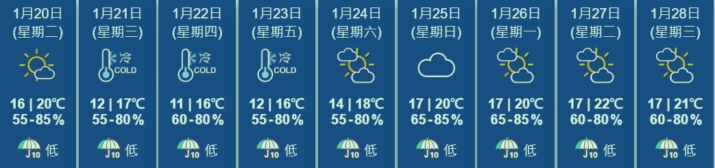 【點新聞報道】天文台今日(20日)發布特別天氣提示指,一股強烈冬季季候風正逐漸影響華南沿岸,預料本港今晚氣溫顯著下降。星期三(1月21日)至星期五(1月23日)大致多雲,天氣持續寒冷,市區最低氣溫在11、12度左右,新界再低兩三度。市民請留意天氣變化,並關顧長者及慢性病患者。