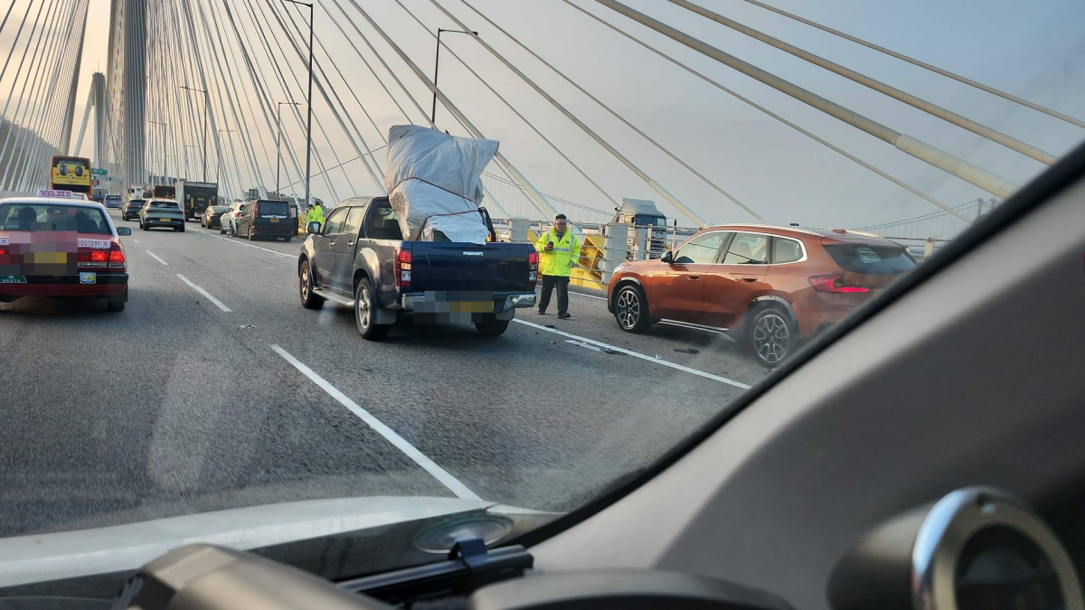 受交通事故影響,汀九橋往青衣方向交通受阻,車龍一度延至青朗公路近大欖轉車站。