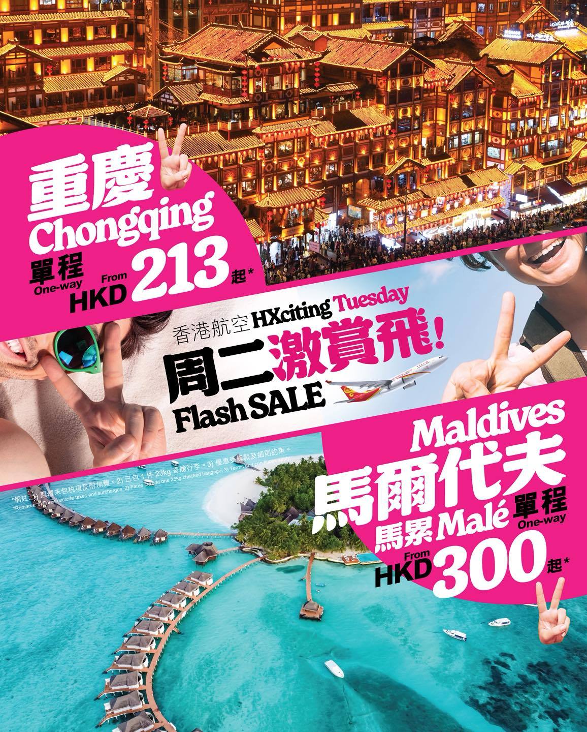 今期香港出發精選航線包括杭州單程$168起、成都單程$208起、重慶單程$213起、麗江單程$438起、重慶來回$323起、悉尼/墨爾本來回$1071起,仲有馬爾代夫$300起、曼谷$124起等航線嘅優惠機票!