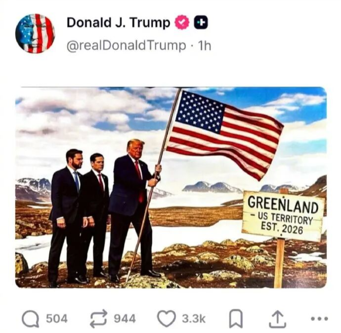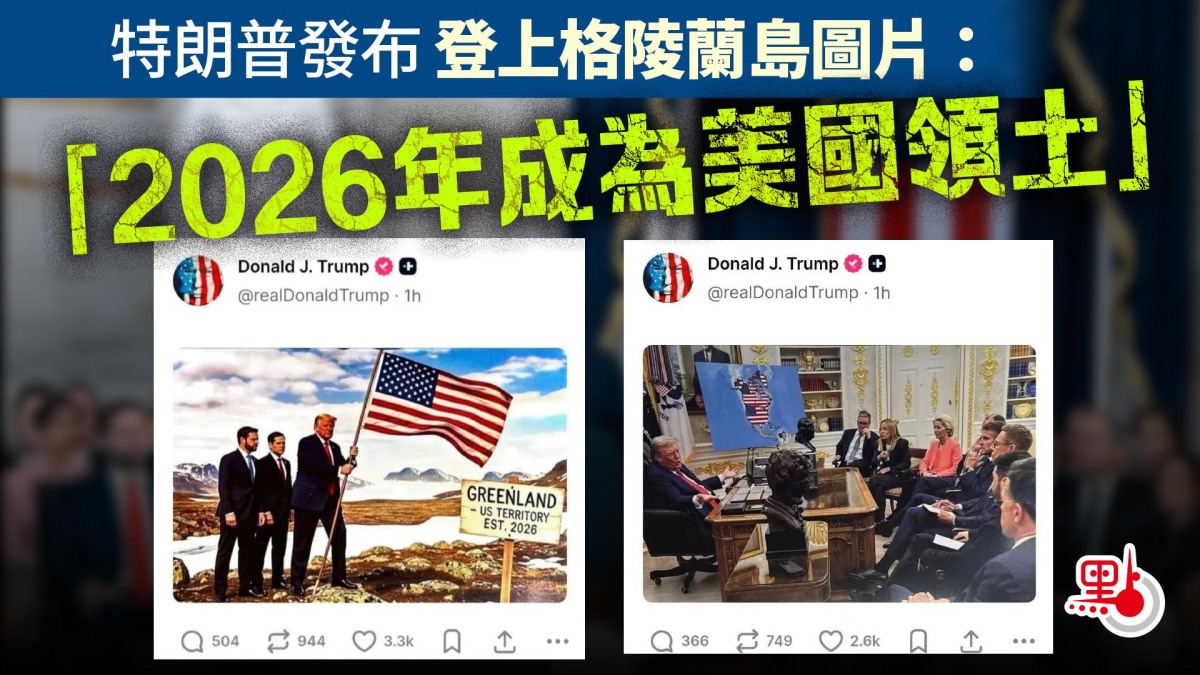 【點新聞報道】據新華社報道,美國總統特朗普當地時間20日凌晨在社交媒體上發布圖片,他手拿美國國旗登上格陵蘭島,身後站着美國副總統萬斯和國務卿魯比奧,旁邊指示牌上寫着「格陵蘭島2026年成為美國領土」。