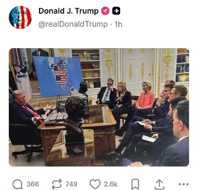 特朗普當天還發布了另一張圖片:他在白宮辦公室與歐洲領導人會面,後面展板上的地圖中,除美國本土外,加拿大、格陵蘭島和委內瑞拉均被美國國旗覆蓋。