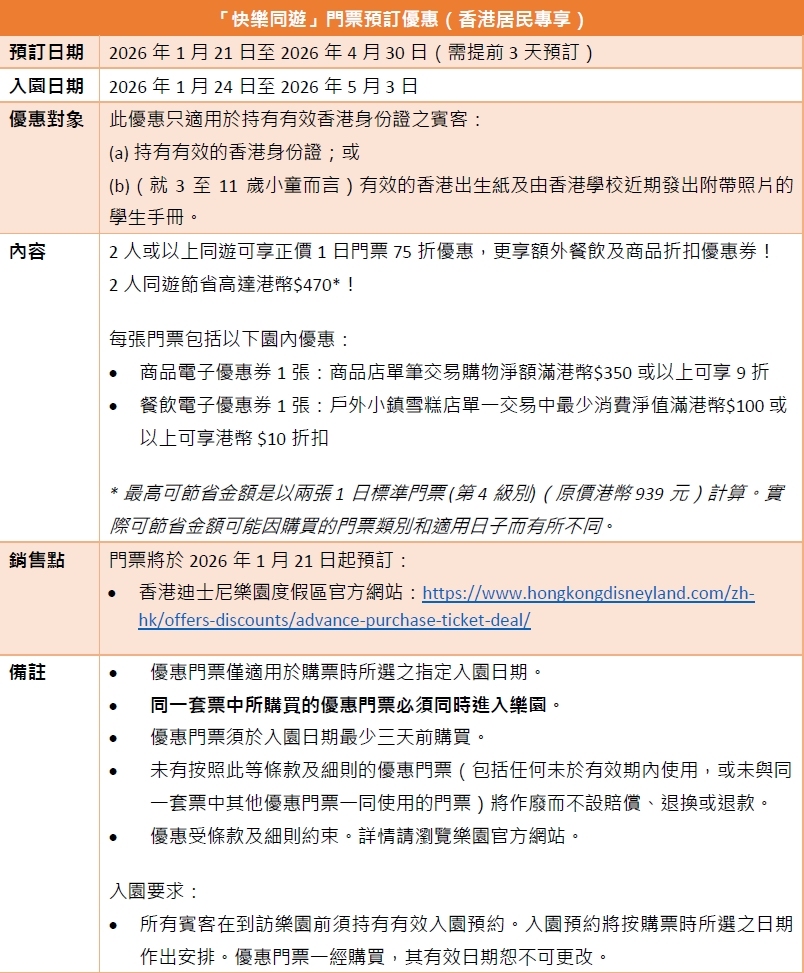 為讓節日團圓更盡興,香港居民更可專享「快樂同遊」門票預訂優惠—由2026年1月24日至5月3日,兩位或以上賓客同遊可享正價1日門票75折優惠,並獲額外餐飲及商品折扣優惠券;二人同遊可節省高達港幣470元!把握限定優惠,相約家人好友一同入園迎接馬年福氣,多人同遊加倍快樂!