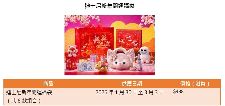 馬年當然少不了滿載好意頭的賀年好禮!香港迪士尼推出「迪士尼新年開運福袋」,內含20周年系列收藏卡或花車巡遊系列珍藏卡,並隨機配搭Duffy與好友主題、《魔雪奇緣》主題及迪士尼朋友主題的商品,更有福袋限定的奇華餅家專屬賀歲糕點禮盒和隨機獲得香港迪士尼獨家限定騎馬接福系列的Gelatoni、StellaLou或LinaBell毛公仔一隻。福袋售價每個港幣488元,一共6款人氣組合,每個組合總值超過港幣1,000元,驚喜度滿分。
