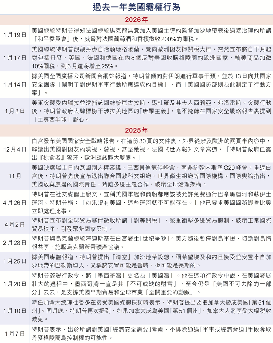 「美方此等劣行比比皆是,不論是強行控制委內瑞拉總統馬杜羅、揚言獲取格陵蘭島、撐軍事打擊伊朗等,均破壞國際規則與秩序。在特朗普執政下的美國退出多個國際組織,以武力脅迫各國,全球治理正陷入失序風險,此類行徑嚴重違背世人對和平發展的期望。」