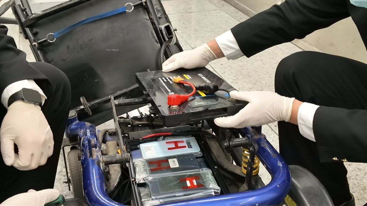 當日,皇崗海關關員在福田口岸對進境旅客及其行李物品進行監管時,發現一名未向海關申報的乘坐電動輪椅的男性旅客經過海關查驗台時,突然加速試圖快速駛離,且輪椅車身微微顛簸,顯得動力異常,海關關員遂對其進行攔截檢查。