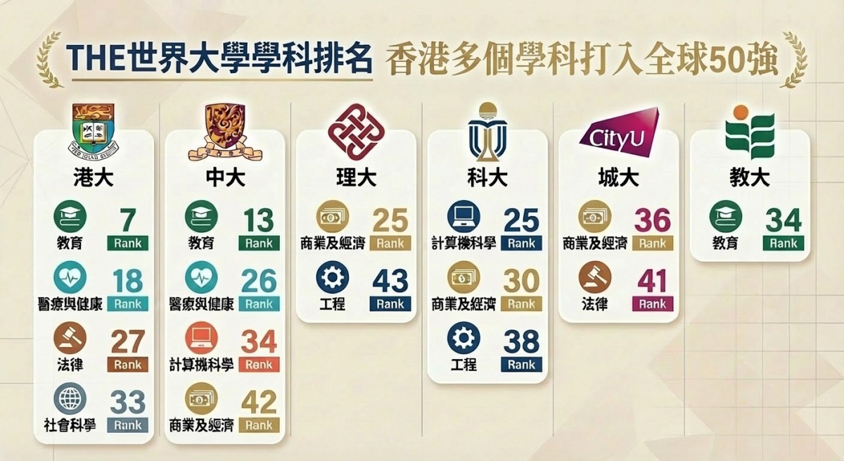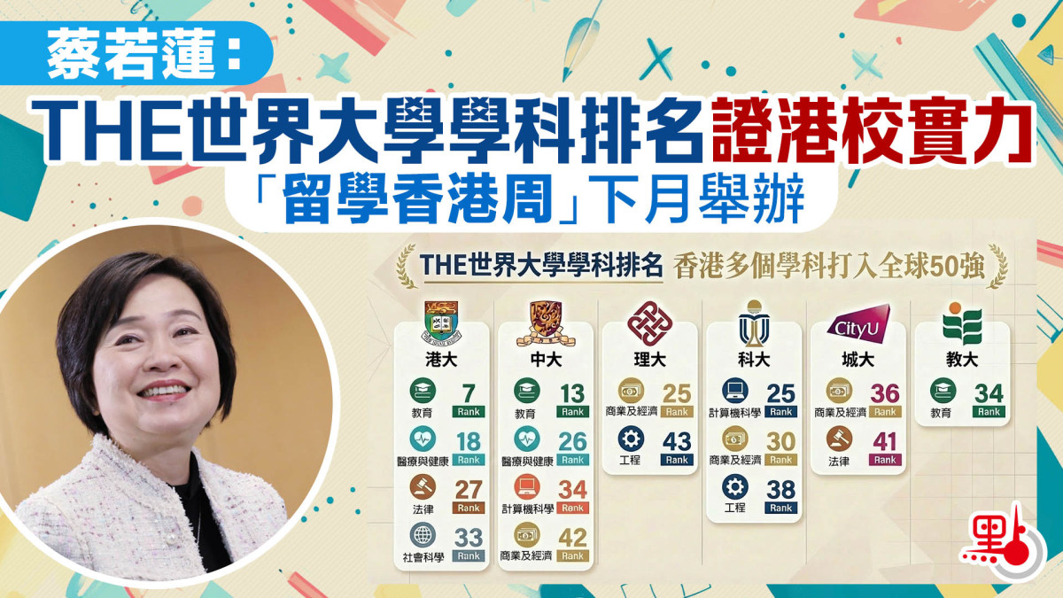【點新聞報道】2026年泰晤士高等教育(THE)世界大學學科排名今日(21日)公布,本港多所大學表現亮眼。教育局局長蔡若蓮在Fb發帖,指港校在排名中展現卓越實力,進一步鞏固本港作為國際教育樞紐的地位。她並透露,當局將於下月舉辦「留學香港周」。
