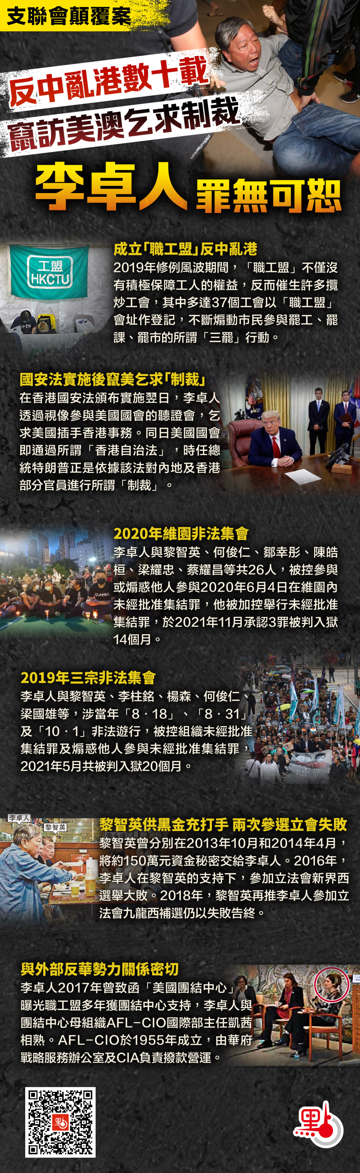 在香港國安法頒布實施翌日,時任支聯會主席李卓人就透過視像參與美國國會的聽證會,乞求美國插手香港事務。同日美國國會即通過所謂「香港自治法案」,時任美國總統特朗普正是依據該法對內地及香港部分官員進行所謂「制裁」。