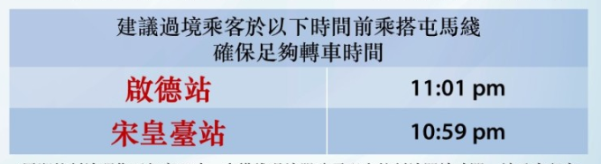 屯馬綫:經港鐵大圍站接駁東鐵綫往羅湖站的最後一班列車將於晚上10時59分由宋皇臺站開出,以及11時01分由啟德站開出。