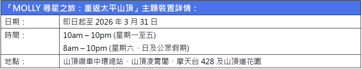 為慶祝MOLLY 20周年誌慶,由即日起至3月31日,山頂纜車及山頂凌霄閣與POP MART及山頂廣場攜手呈獻「MOLLY尋星之旅:重返太平山頂」活動。這次MOLLY尋星之旅共有8大互動打卡區,由山頂纜車中環總站展開,沿途經過山頂凌霄閣、摩天台428及山頂道花園至太平山頂,每個場景均代表MOLLY旅程中的一個章節,一個個的標誌性造型更呈現她20年來的成長歷程,帶領各位一步步走入MOLLY的童趣世界。