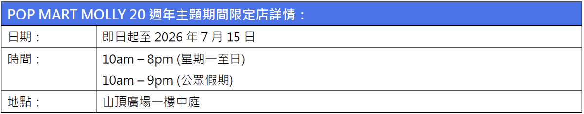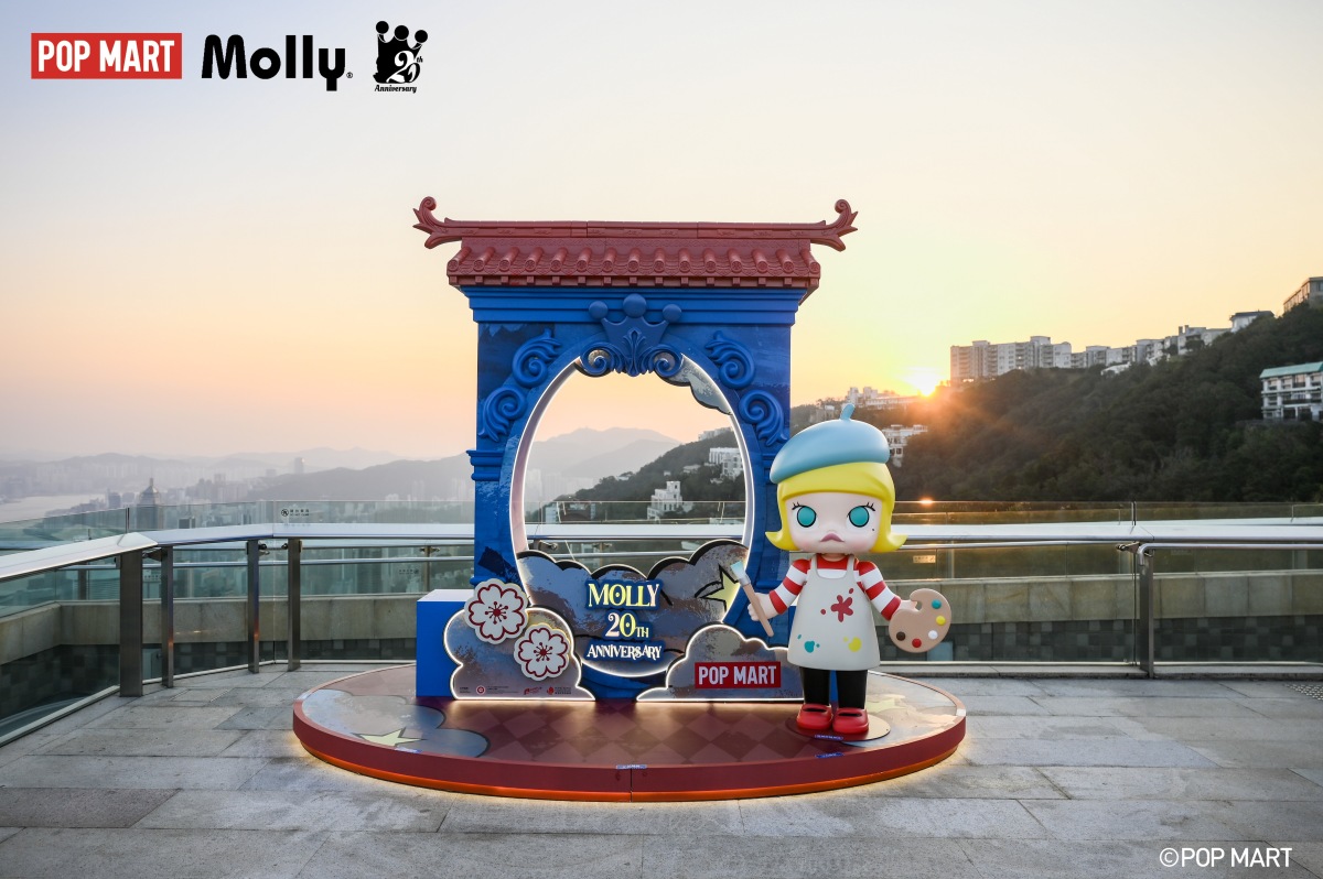 MOLLY粉絲更可前往山頂凌霄閣參與「MOLLY星願打卡活動」,於指定地點收集印章,親手打造專屬你的「MOLLY星願賀卡」,為這趟旅程留下閃耀印記!不要錯過在山頂廣場的POP MART MOLLY 20周年主題期間限定店。MOLLY周年雕塑「風和日麗」樹立於期間限定店門前,門店亦加置了多幅MOLLY 20周年特別設計的插畫,等候MOLLY的夥伴發掘。