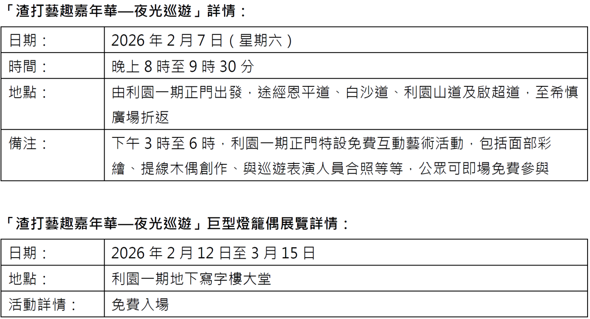 利園二期設有豐富親子活動,包括專為兒童而設的「菲林糖果盒」賀年行大運、馬賽克新式揮春及獅頭彩繪新春工作坊。利園區將於1月30日起在利園一期正門打造「新春市集」,雲集超過20個本地品牌與手作單位,範疇涵蓋賀年應節食品及特色美食、傳統工藝和文化體驗、年花盆栽等,讓不同年齡層的顧客都能沉浸在濃厚的節日氛圍中。