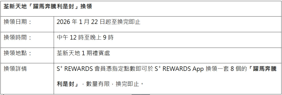 今個新年荃新天地特別設計「躍馬奔騰利是封」,上下擺動利是封即可以見到駿馬奔騰的英姿。利是封一盒8個(每款4個),1月22日起S+REWARDS會員可於S+REWARDS App以指定點數換領,送禮自用兩相宜。