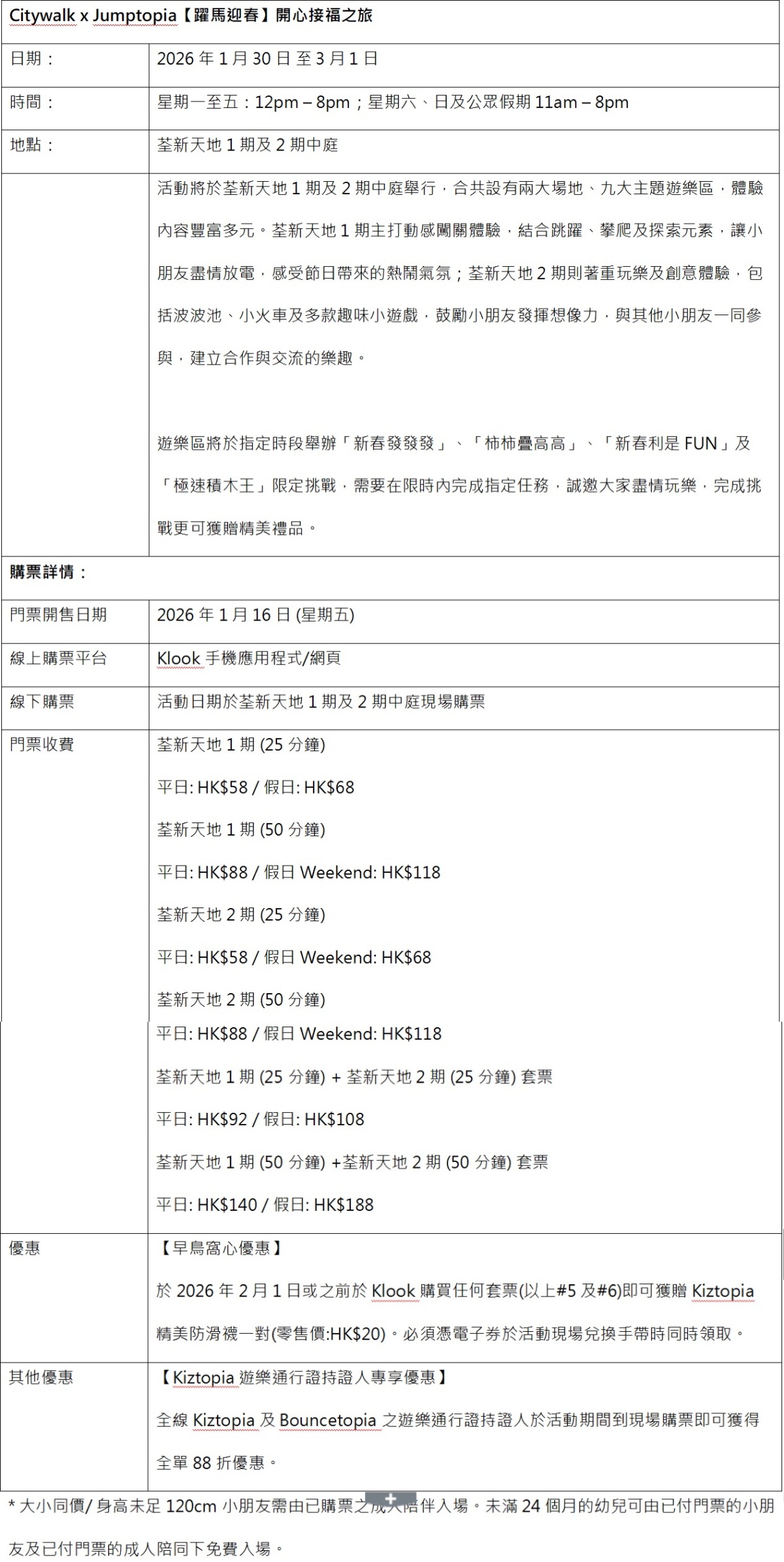 今個馬年,荃新天地Citywalk聯乘Jumptopia隆重呈獻「躍馬迎春」開心接福之旅,打造充滿祝福與歡樂的親子遊樂體驗。1月30日至3月1日,一眾深受小朋友喜愛的Kiztopia Friends將換上新春造型登場,陪伴小朋友穿梭各個主題遊樂區,投入一場熱鬧歡樂的新春旅程。