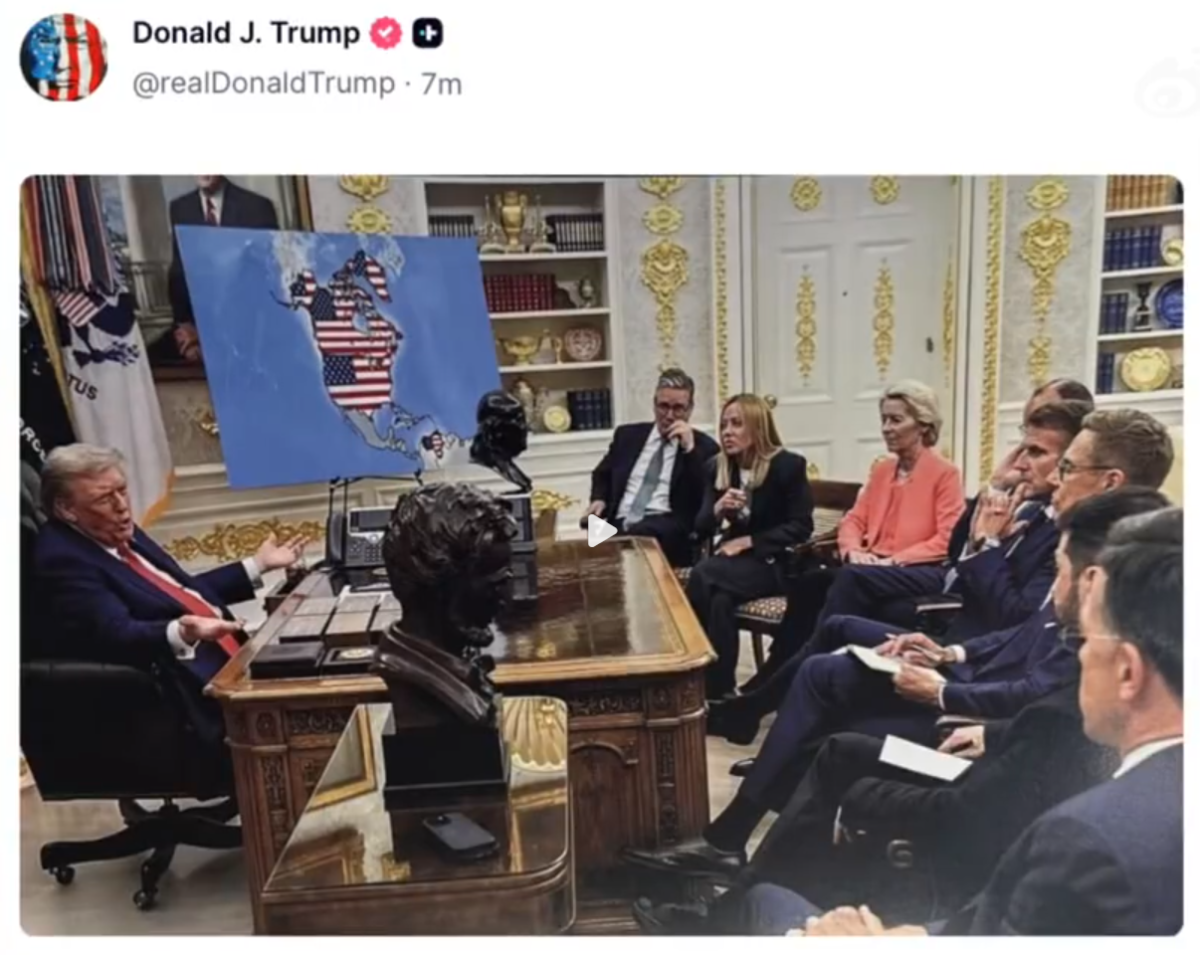 特朗普當天還發布了另一張圖片:他在白宮辦公室與歐洲領導人會面,後面展板上的地圖中,除美國本土外,加拿大、格陵蘭島和委內瑞拉均被美國國旗覆蓋,揭示了美國急於擴張版圖的野心。