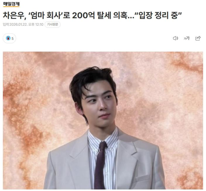 報道稱,車銀優2025年曾因涉嫌逃稅被調查。針對車銀優的逃稅指控與近期多位韓國藝人通過「空殼公司」逃稅的指控結構類似。這種逃稅方式是指藝人通過其家人成立「空殼公司」,將收入計算在這家公司名下,實現避稅。