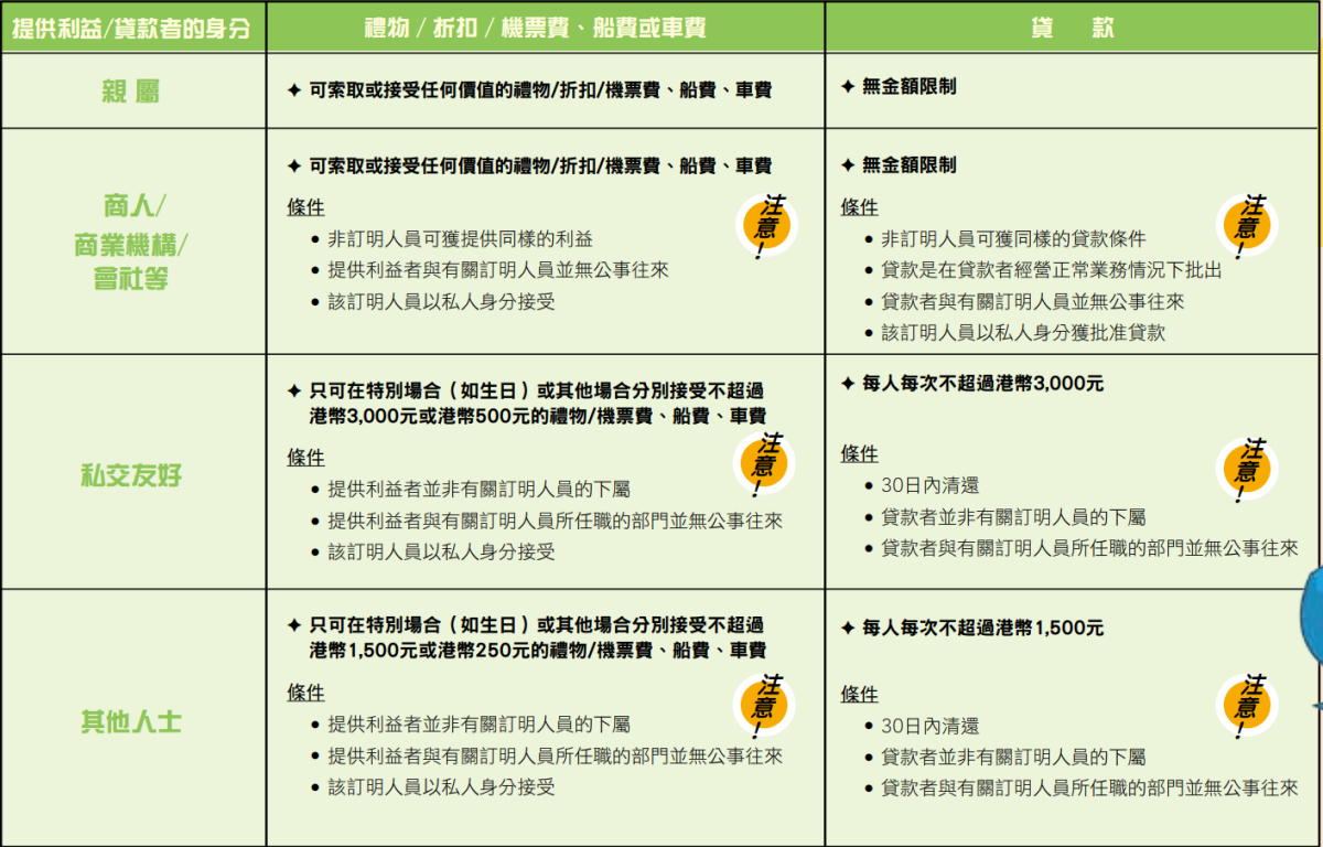 根據《防止賄賂條例》﹙第201章﹚第4條,任何政府人員均不得索取或接受利益,作為濫用職權的誘因、報酬或原因;提供利益者也屬違法。