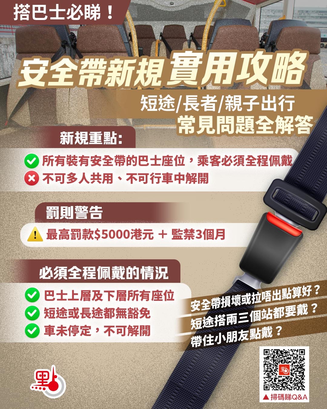 最後來關注安全帶新規。巴士佩戴安全帶新規定將於周日(1月25日)開始實施,凡巴士座位已裝設安全帶,乘客必須全程佩戴,違者最高可被罰款5000元及監禁3個月。