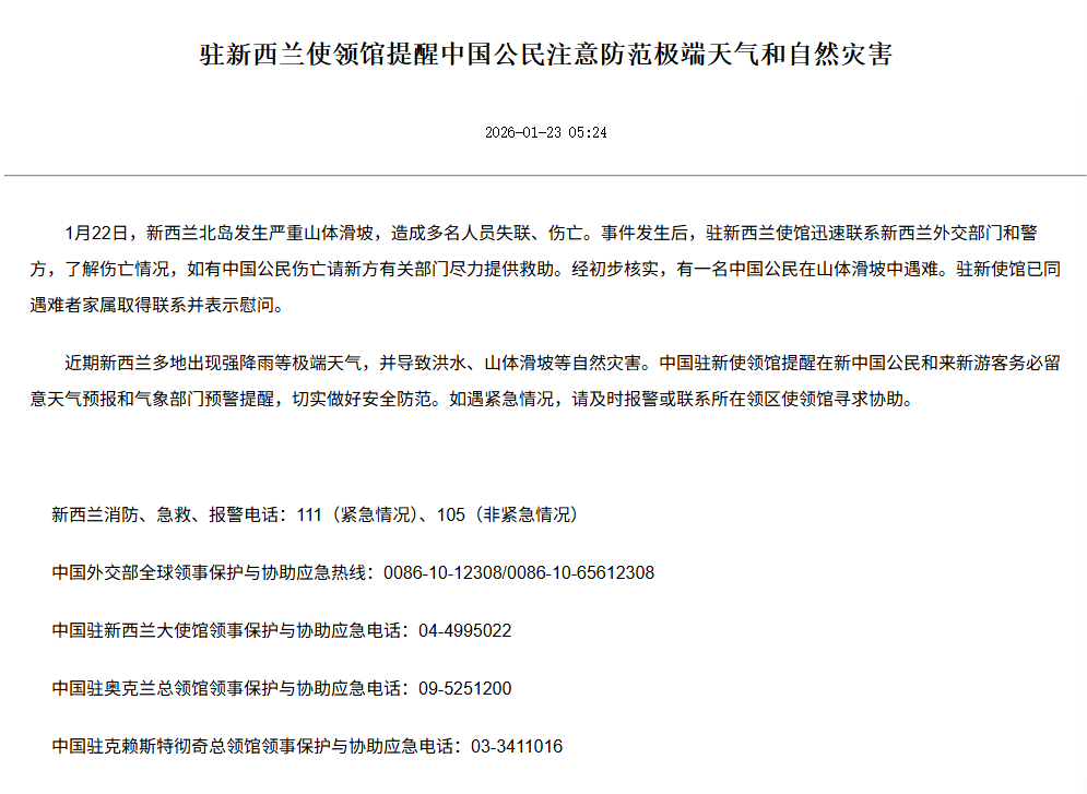 【點新聞報道】1月22日,新西蘭北島普倫蒂灣地區的芒阿努伊山山腳下一處假日公園發生嚴重山泥傾瀉,已知造成至少兩人死亡,多人失蹤。事件發生後,駐新西蘭使館迅速聯繫新西蘭外交部門和警方,了解傷亡情況,如有中國公民傷亡請新方有關部門盡力提供救助。經初步核實,有一名中國公民在山體滑坡中遇難。駐新使館已同遇難者家屬取得聯繫並表示慰問。
