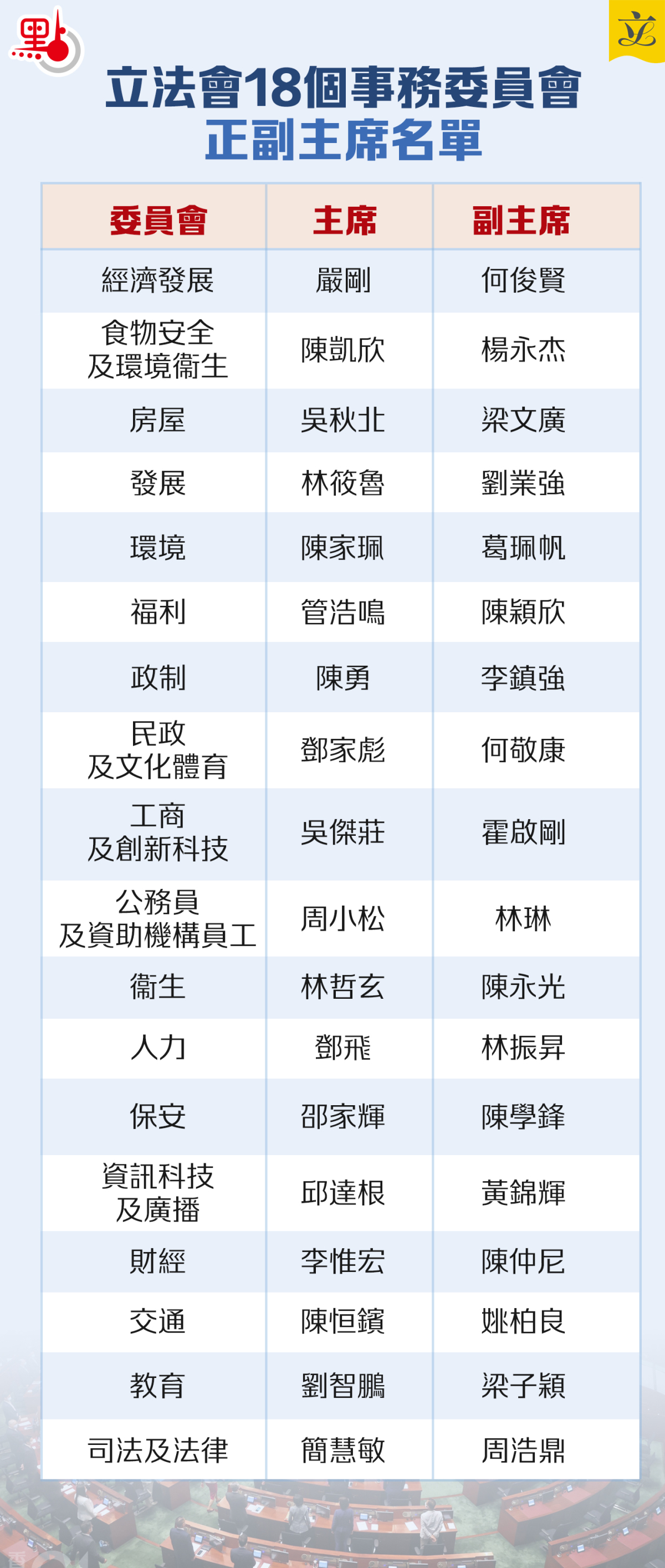 司法及法律事務委員會:主席為簡慧敏、副主席為周浩鼎