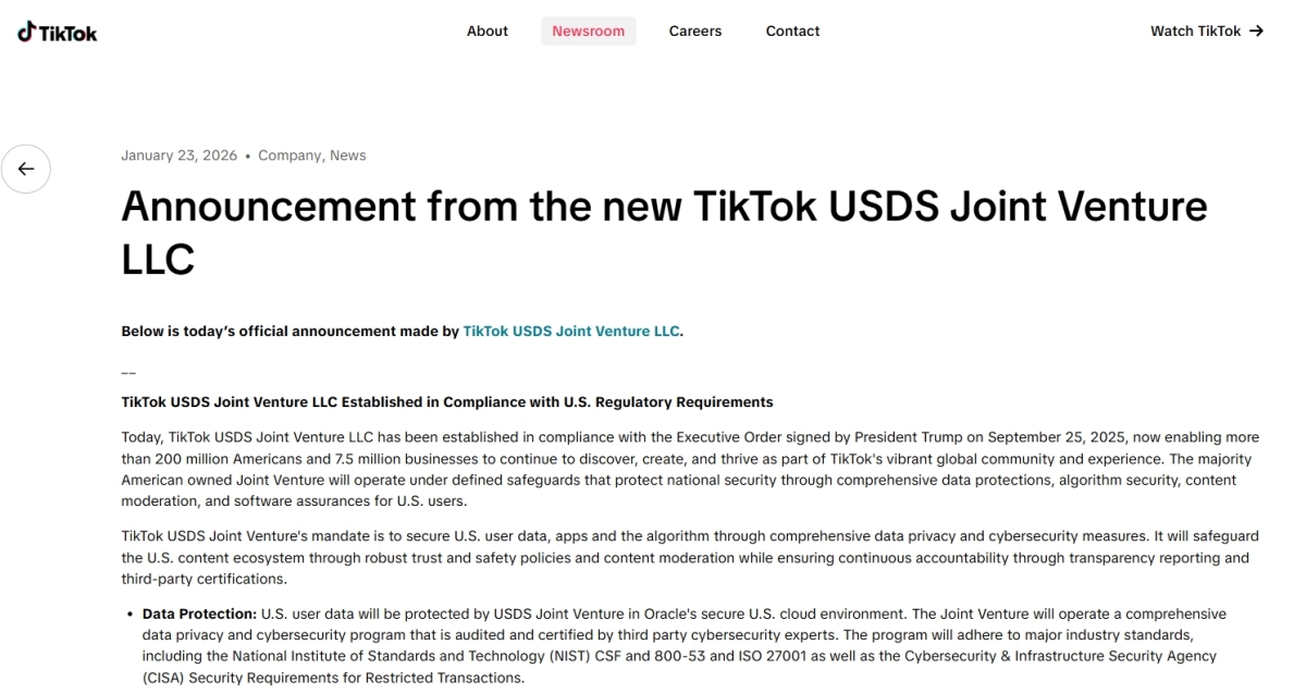 【點新聞報道】據澎湃新聞報道,短視頻巨頭TikTok美國業務方案正式落地。1月23日,TikTok發布公告:已成立TikTok美國數據安全合資有限責任公司(TikTok USDS Joint Venture LLC)。該合資公司將負責TikTok美國的數據保護、算法安全、內容審核及軟件保障。