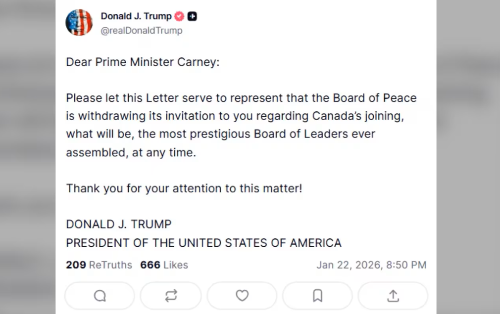 特朗普寫道:「尊敬的卡尼總理,謹以此信代表『和平委員會』告知,撤回向你發出的有關加拿大加入(『和平委員會』)的邀請。」