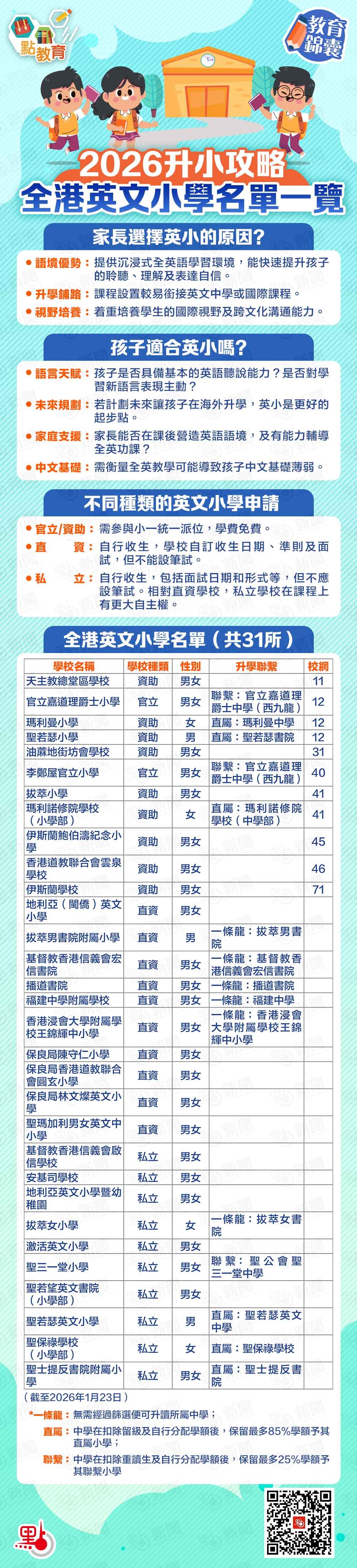 【點新聞報道】不少家長希望孩子及早適應全英語學習環境,因而選擇報讀英文小學。事實上,除學費昂貴的國際學校外,香港亦有多所官立、資助、直資及私立小學以英文為主要教學語言。2026學年小一統一派位申請將於1月25日截止,家長交表前,不妨先全面了解英文小學的選擇與申請重點,查漏補缺。