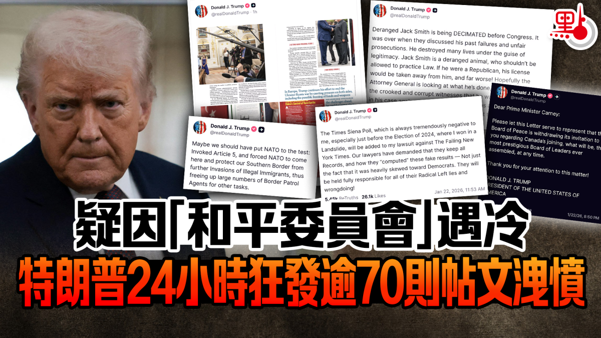 【點新聞報道】據美媒《每日野獸》報道,特朗普疑因在達沃斯世界經濟論壇上受挫,及高調啟動「和平委員會」卻遭多國領導人無視,導致其在24小時內於社媒平台Truth Social連續發布超過70則帖文。
