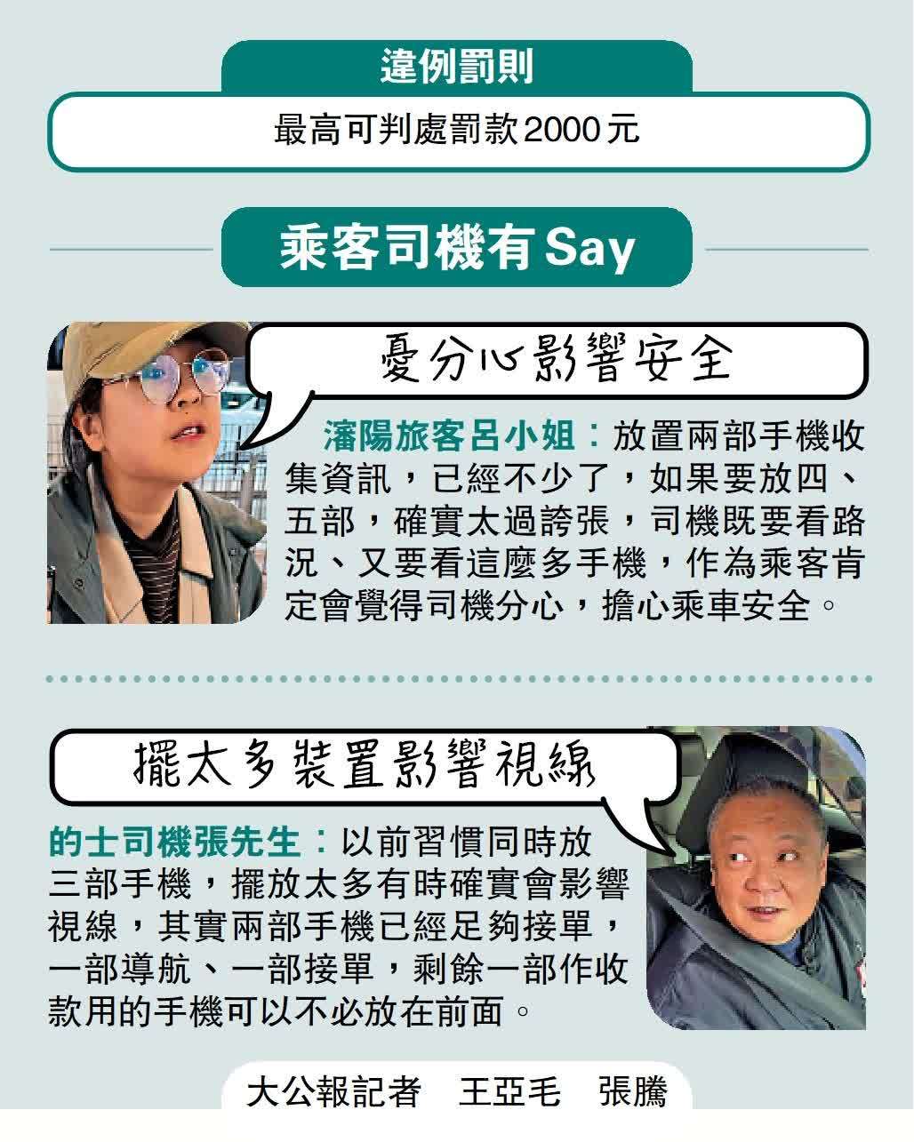 大公報記者昨日在多個的士站點觀察,發現新規定實施前夕,多數的士遵守法例,駕駛座前留下空的手機座,有司機形容兩部已足夠接單,無法兼顧太多手機資訊;亦有少數司機仍擺放三或四部手機,聲稱會在今日減至兩部。有業界人士指,不排除出現個別司機手持手機使用的情況,同樣或招致駕駛風險,希望未來有更清晰指引。