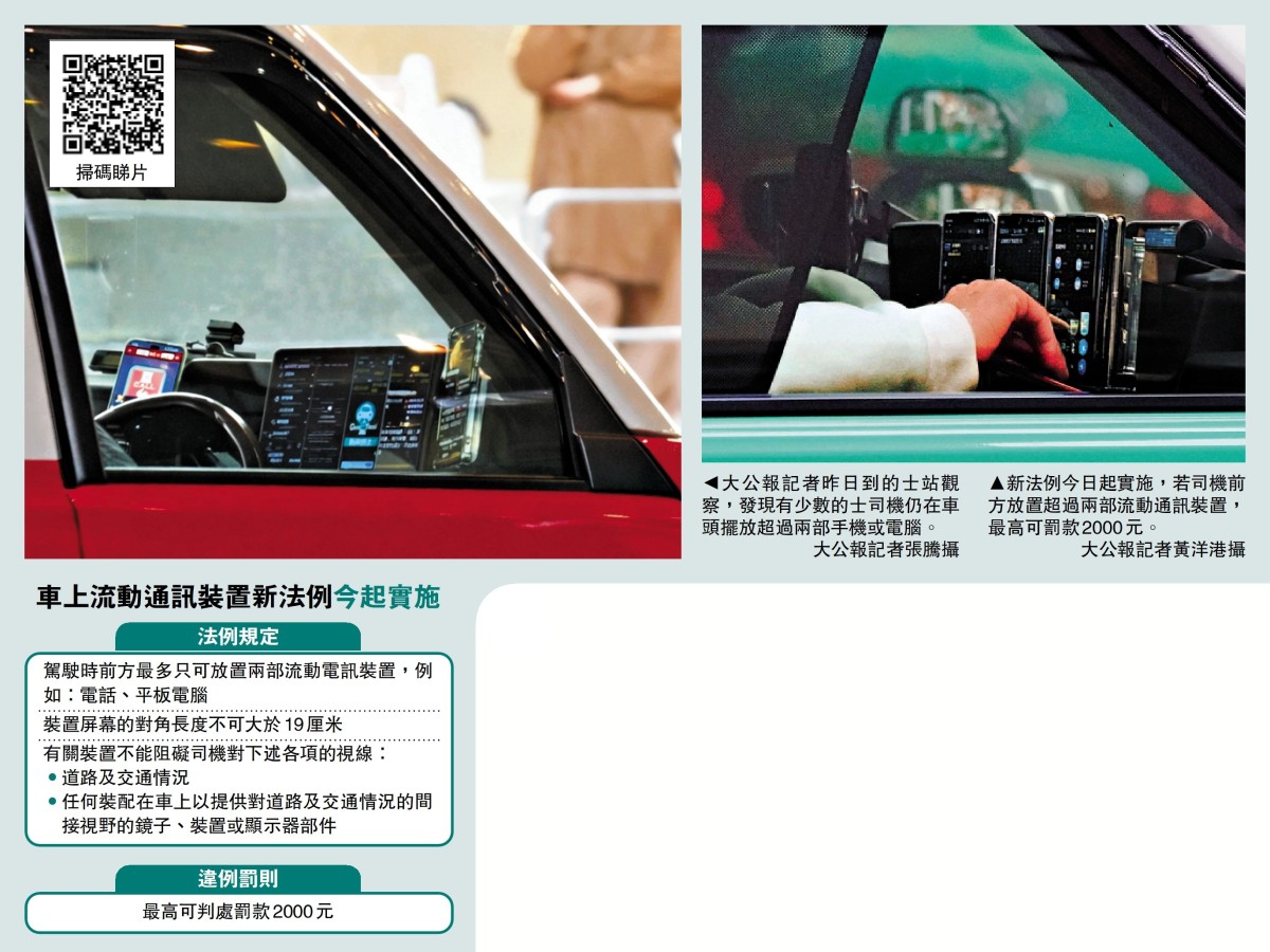 車上流動電訊裝置新法例今日(25日)起實施,規定司機前方最多放置兩部手提電話或平板電腦,裝置的尺寸及放置地方亦受到規管,違例者最高罰款2000元。