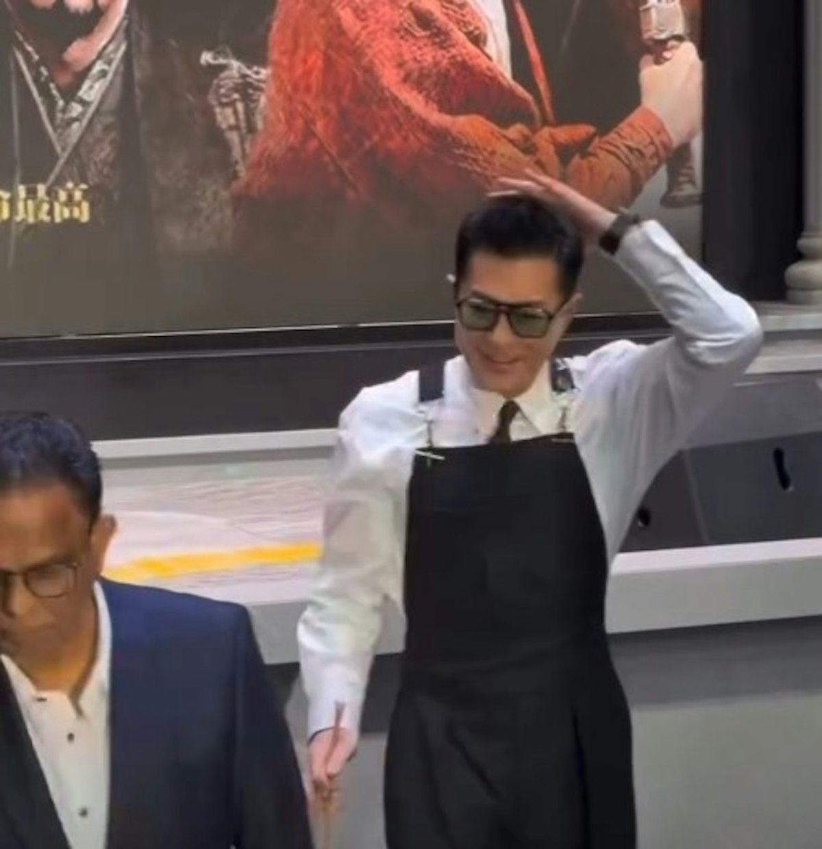 原先各人只要拿起筷子,輕起「撈起」拍照便完成,不過古老闆似乎撈得興起,愈撈愈高,突然有一箸菜撈至拋上半空,嚇到身旁的宣萱花容失色慘叫,怕被菜絲波及,但結果是古生自己「中頭獎」。隨後他更拿起另一箸,作狀向觀眾「送上」。