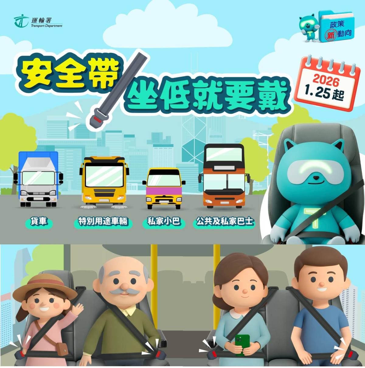 運輸署稱,新規定實施初期,會以持續加強宣傳和公眾教育為先,協助乘客養成自覺佩戴安全帶的習慣和安全意識,從而培養安全出行文化,提升道路安全。安全帶能在發生意外時對車上乘客提供關鍵保謢,司機和乘客在迎頭相撞意外中死亡和重傷的機會分別可減少約4成和7成。