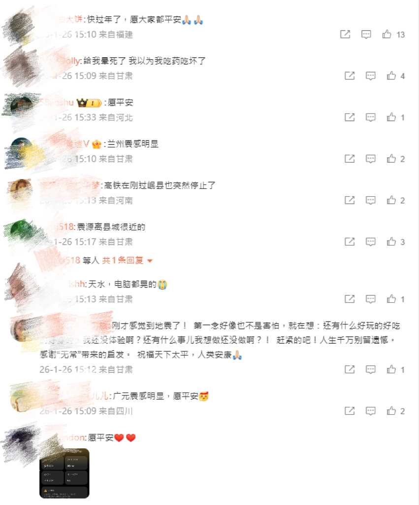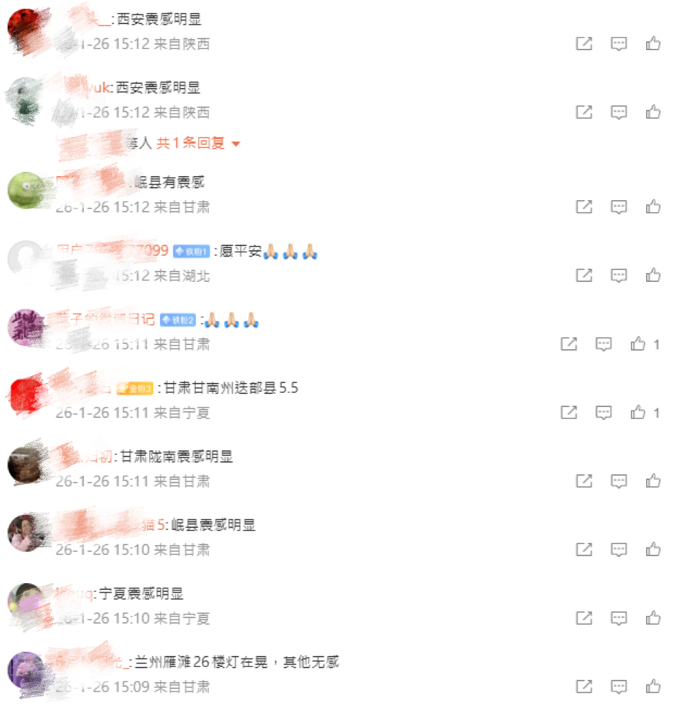 地震發生後,甘肅、四川、陝西、寧夏等多地居民均於網絡平台表示震感明顯,「蘭州雁灘26樓燈在晃」、「(四川)廣元震感明顯」、「銀川,搖晃的很暈」。