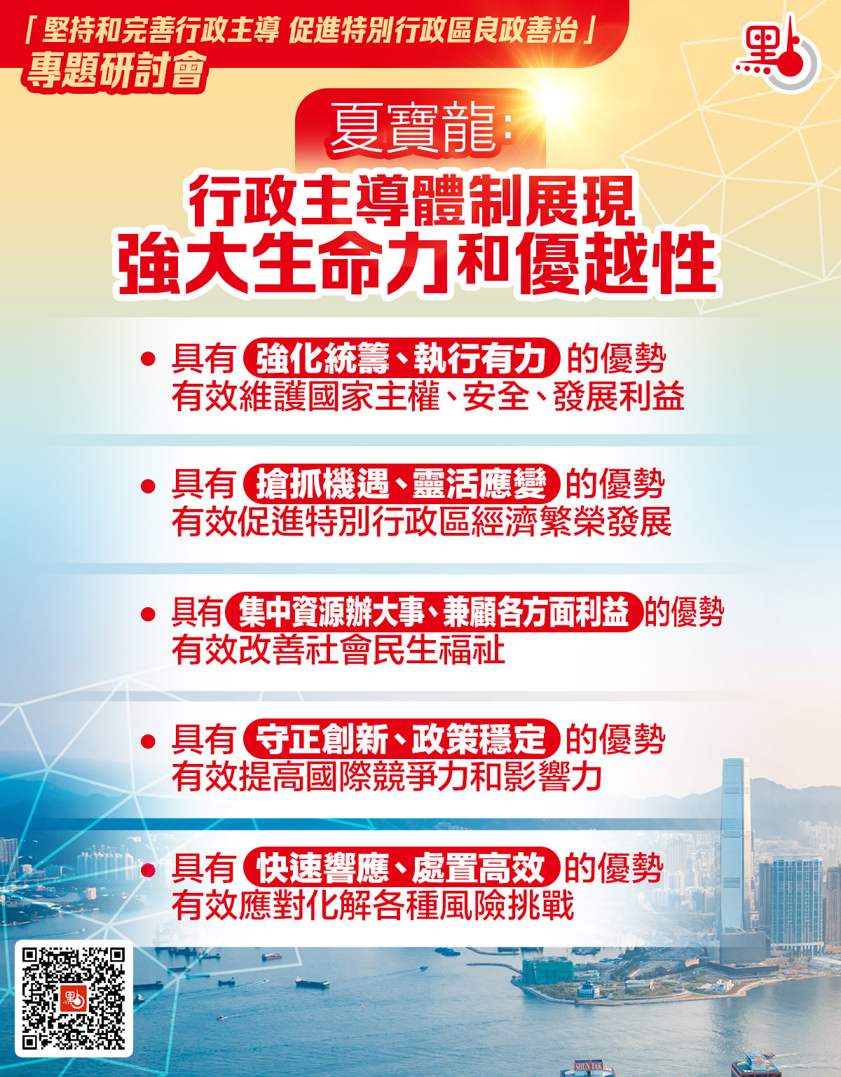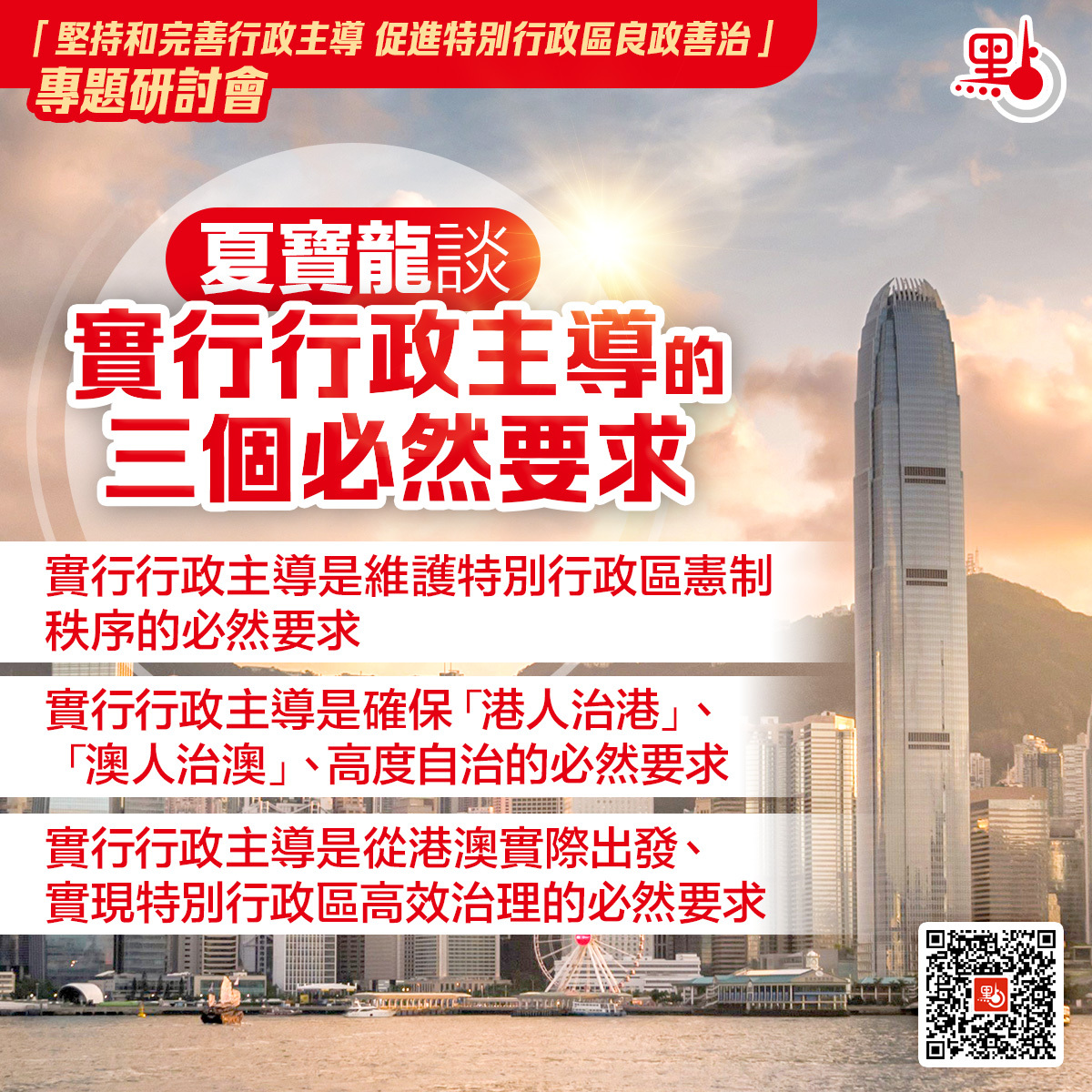 夏寶龍表示,習近平主席在聽取香港、澳門特別行政區行政長官述職時,對香港、澳門特別行政區政府都提出「堅持和完善行政主導」的明確要求。習近平主席的重要講話從全局和戰略高度,重申中央堅定不移貫徹「一國兩制」方針的原則立場,飽含着對港澳同胞的深情關懷、對港澳發展的堅定支持、對特別行政區良政善治的殷切期望,為特別行政區落實行政主導、提高治理效能、推動高質量發展指明方向,具有很強的現實針對性和深遠的歷史意義。