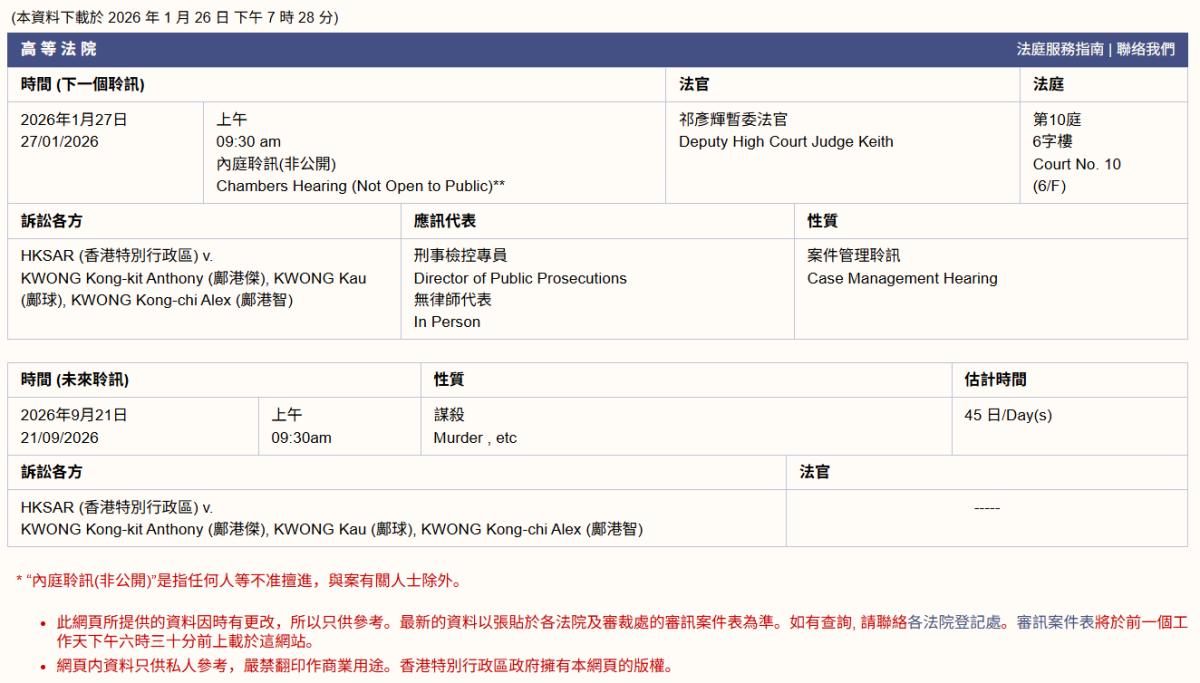 【點新聞報道】名媛蔡天鳳2023年被殺害及碎屍,前夫鄺港智、前家翁和前大伯被控謀殺及阻止合法埋葬屍體罪。據司法機構網站顯示,案件將於今年9月21日開審,料審45日。明日(27日)於高等法院進行非公開的案件管理聆訊。