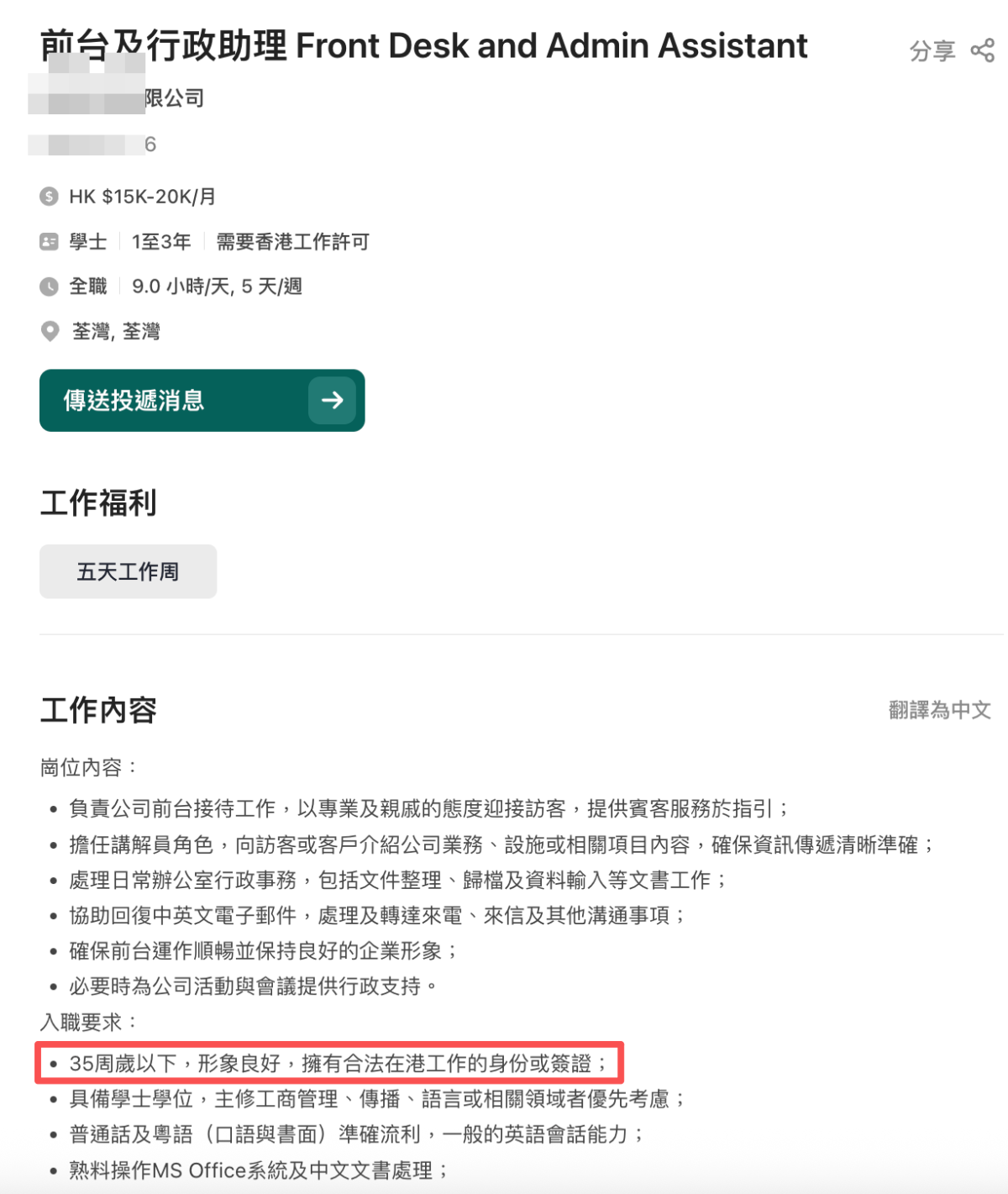 網頁顯示,該招聘廣告發布於1月16日,招聘職位為「前台及行政助理」。廣告中除要求「形象良好」外,更明確列出了「35周歲以下」的年齡條件。翻查資料,勞工處有關消除就業方面的年齡歧視的指引提到,在招聘廣告方面,僱主應以劃一的甄選準則和中立的措辭刊登招聘廣告,吸引不同年齡的合適人士應徵,除非有關職位確實需要年齡規定,例如兒童劇場的小演員,否則不要在招聘廣告內列明應徵者須介乎某個年齡。