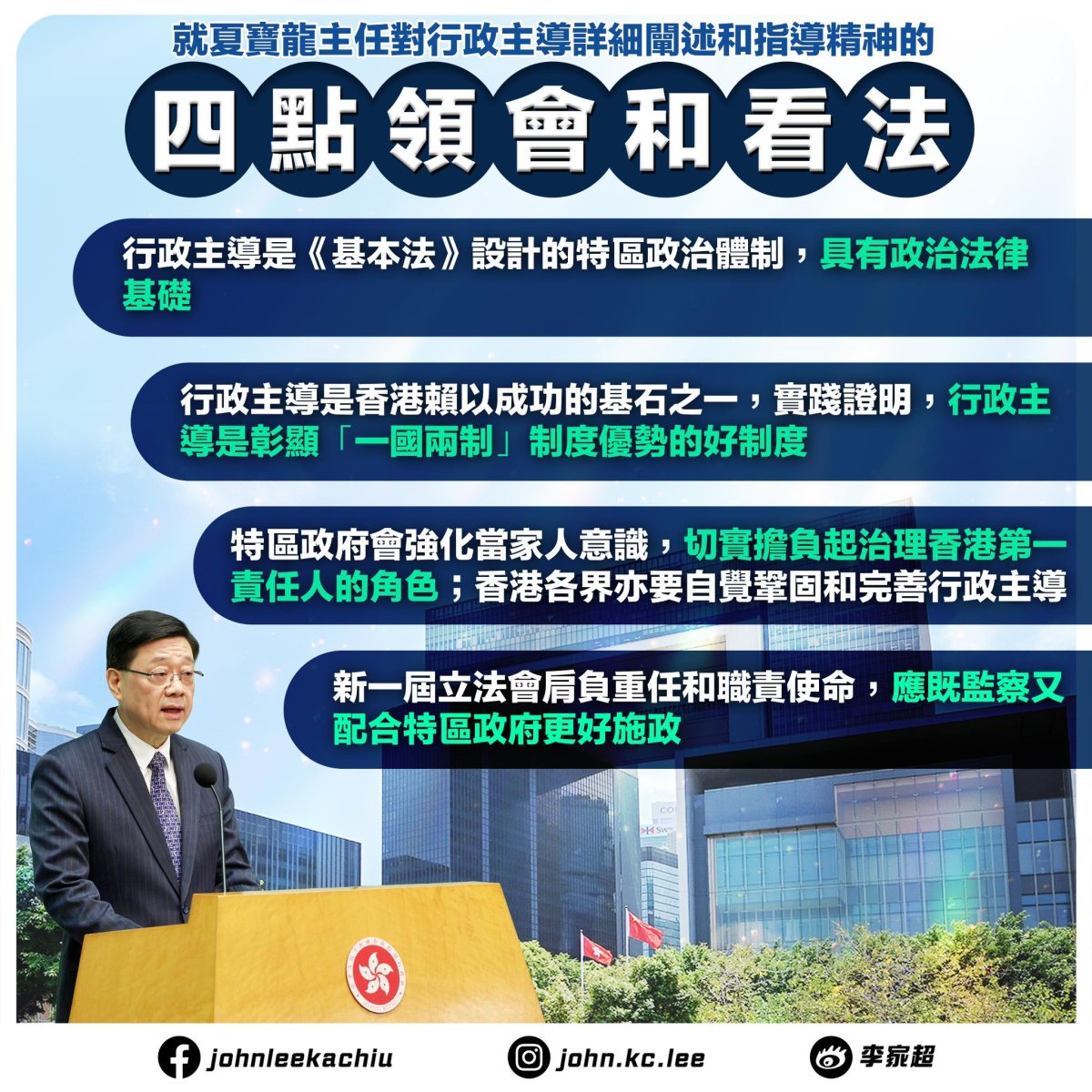 李家超說,夏寶龍主任就「堅持和完善行政主導」的詳細闡述和指導精神有很大的啟發性。對此,李家超分享了4點深刻體會。首先,行政主導是基本法設計的特區政治體制,具有政治法律基礎。第二,實踐證明,行政主導是彰顯「一國兩制」制度優勢的好制度,具有現實和歷史實踐意義。基本法在討論起草過程中,就將行政主導作為設計回歸後政治體制的重要部分。第三,特區政府會強化香港當家人意識,切實擔負起治理香港第一責任人的角色;香港各界亦要自覺鞏固和完善行政主導。香港回歸以來,各種干擾、阻撓、破壞行政主導的慘痛教訓提醒大家,要珍惜來之不易的大好局面,自覺維護好和落實好行政主導。第四,新一屆立法會肩負重任和職責使命,應既監察又配合特區政府更好施政。