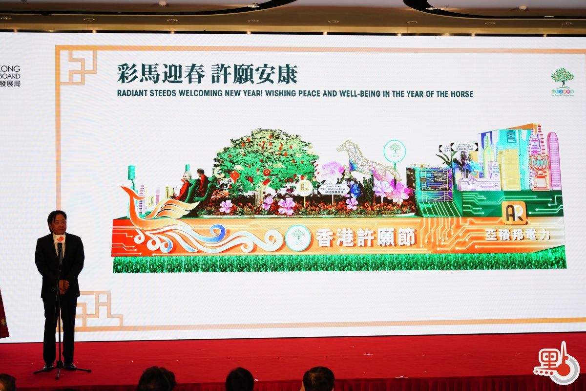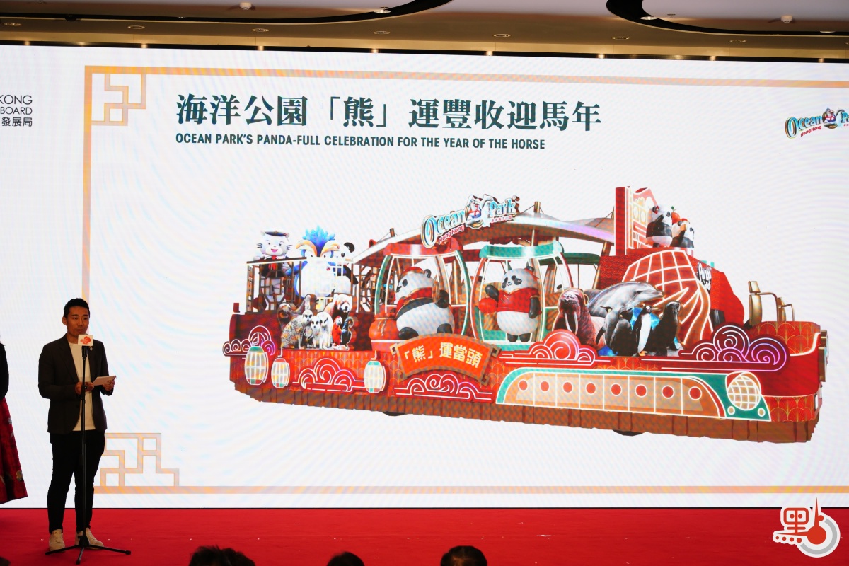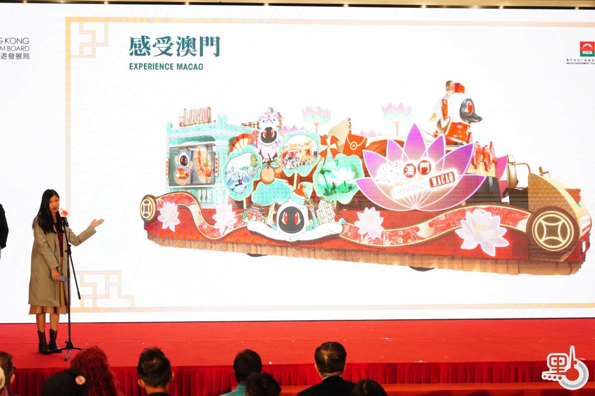 8.澳門特別行政區政府旅遊局:以「感受澳門」為主題,融合荷花、吉祥物「麥麥」、世界遺產及美食之都元素,車頭的「財神麥麥」將手持利是向市民派發祝福。
