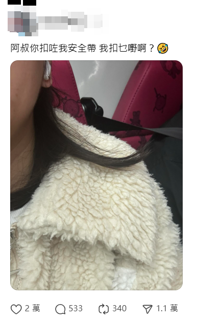這一境遇戳中大批網民笑點,「合巹交杯」「你扣住我 我扣住你」「阿叔扣安全帶,你扣5000蚊」「呢個算唔算合理辯解(?)」。有網民搞笑安慰樓主,「冬天嘛,佢幫你整暖條帶先啫,10分鐘後會還架啦」,樓主則承情說「好人做好事」。