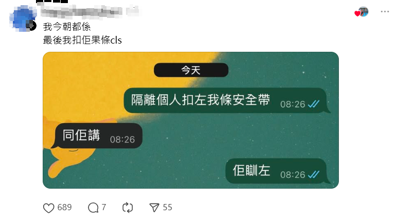 【點新聞報道】1月25日起搭巴士要扣安全帶,香港道路交通安全新規近日在全城掀起連番熱議,網上更是笑料不斷。昨日(1月26日)是新規實施首個工作日,大批打工仔必須面對這一「避無可避」的難題,Threads流傳一則「扣錯安全帶」的帖文引爆全民笑點。