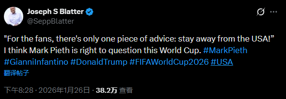 【點新聞報道】英國《衛報》26日報道,國際足協(FIFA)前主席白禮達(Sepp Blatter)在社交平台發文,表示對主辦國之一的美國有安全憂慮,呼籲球迷勿前往當地觀賽。
