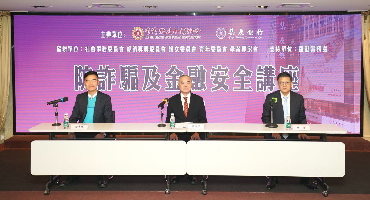 【點新聞報道】1月22日,由集友銀行與香港福建社團聯會聯合主辦、香港警務處支持的「防詐騙及金融安全講座」在香港福建社團聯會會所圓滿落幕。集友銀行行政總裁徐俊,福建社團聯會主席施清流,警務處東區警區指揮官總警司陳天柱,集友銀行副總裁王冰玲、總行個人金融業務部總經理胡凱文出席活動,講座共吸引超過300名閩籍鄉親與香港市民踴躍參與,現場氣氛熱烈。