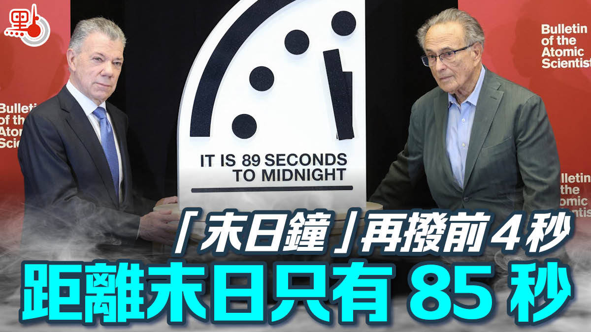 【點新聞報道】科學家將標誌人類威脅的「末日鐘」(Doomsday Clock)撥快4秒,距離象徵世界末日的午夜只有85秒,是自1947年設立以來最接近午夜的一次,亦是4年來第3次將末日鐘撥近午夜。
